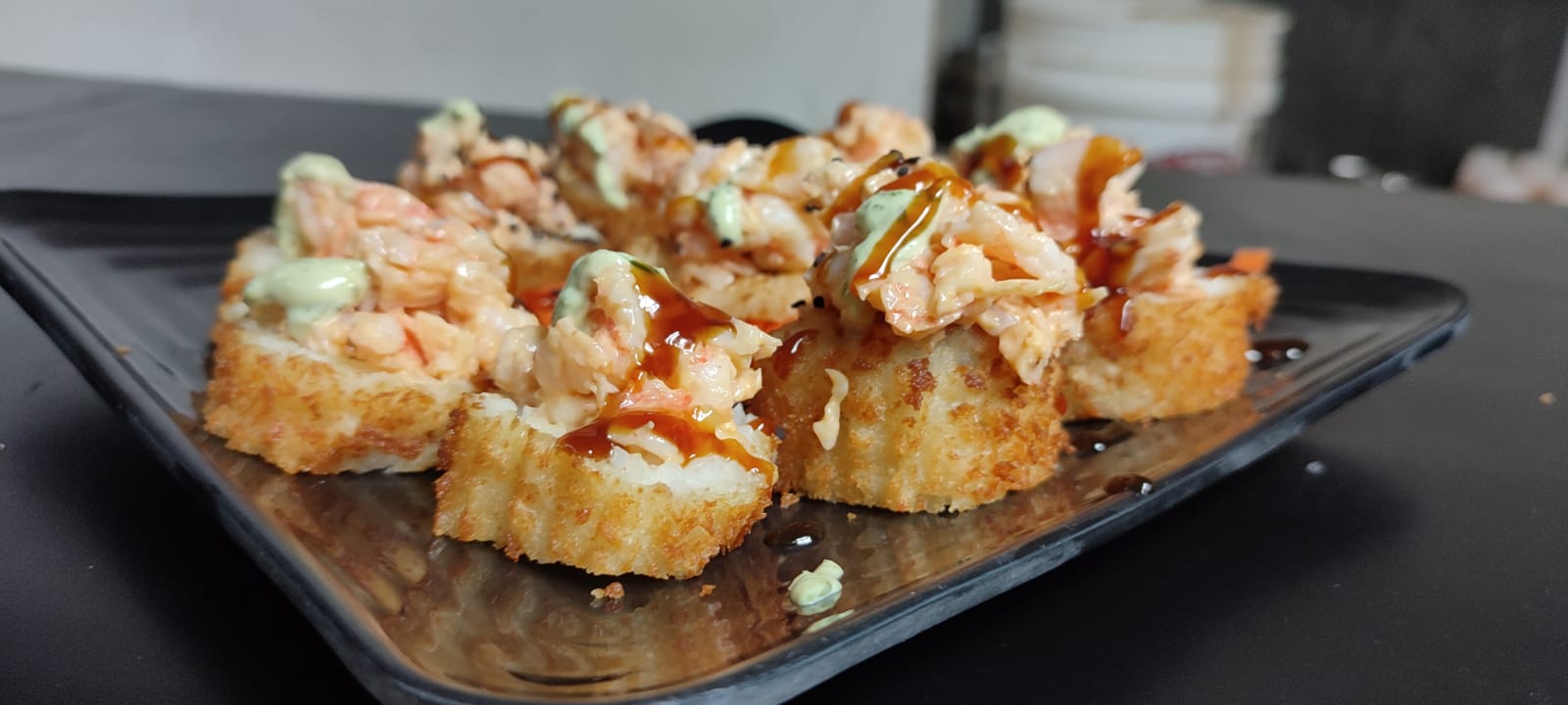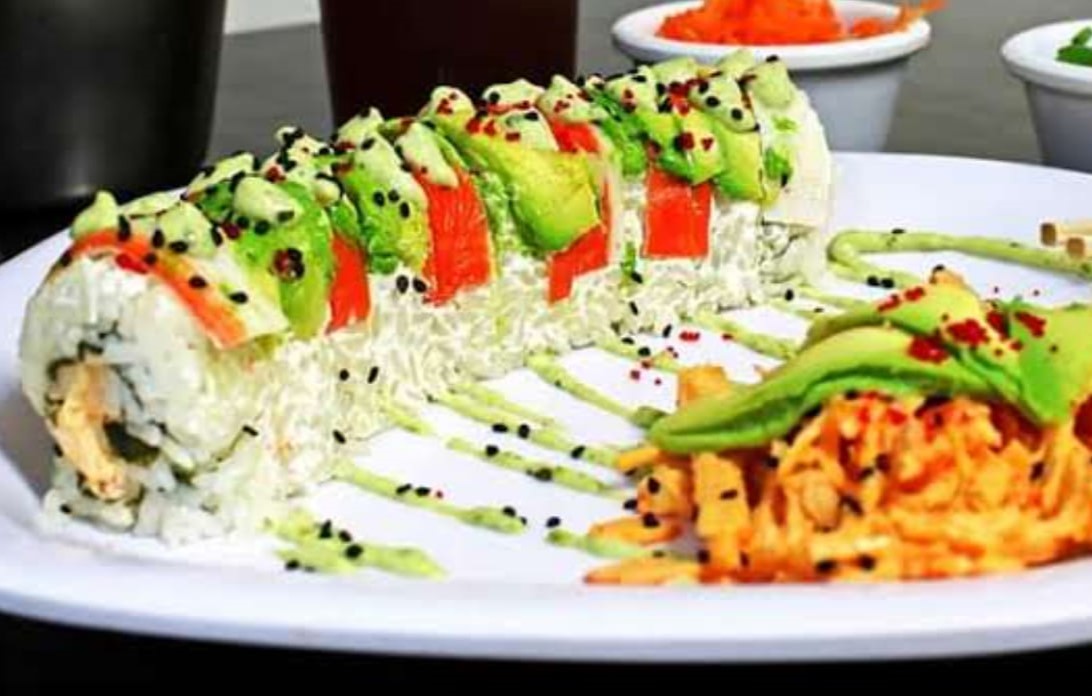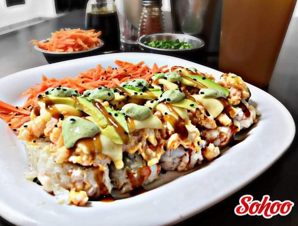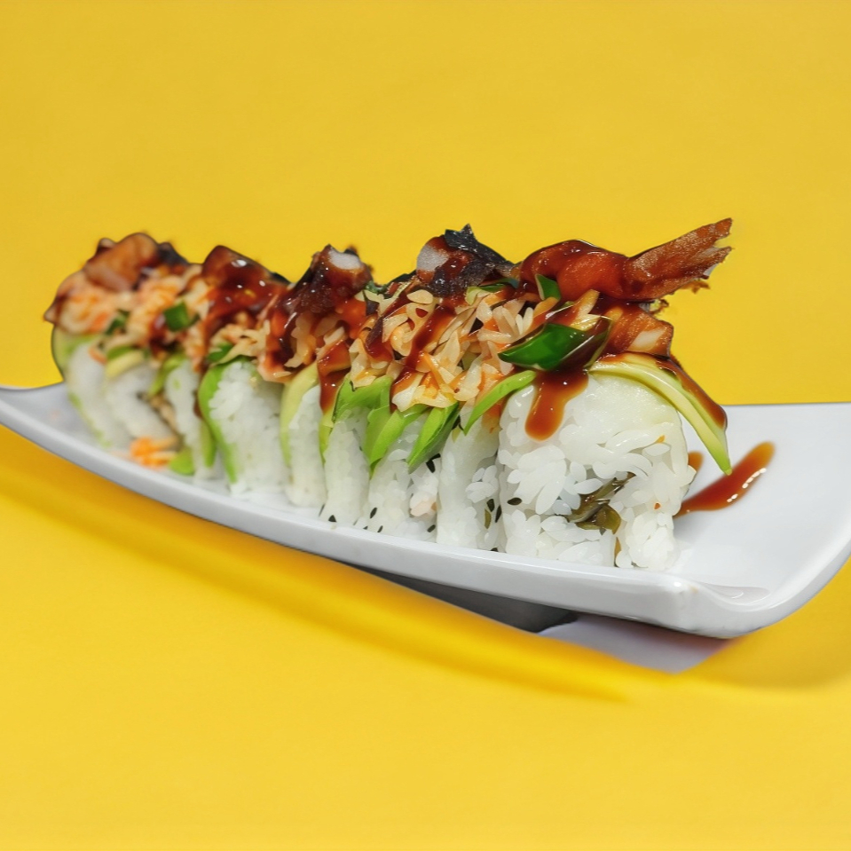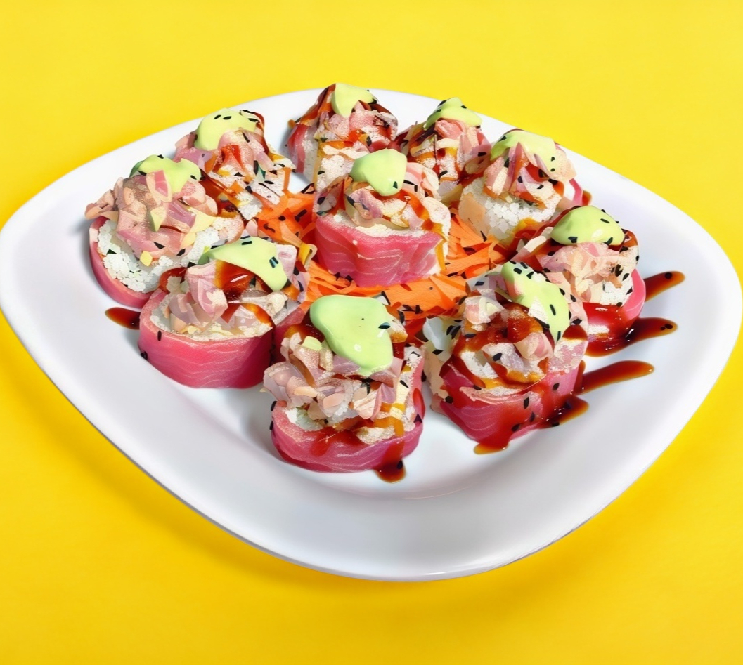 Tampico, forrado de aguacate, topping spicy de cangrejo, trozos de camarón empanizado y salsa de anguila.