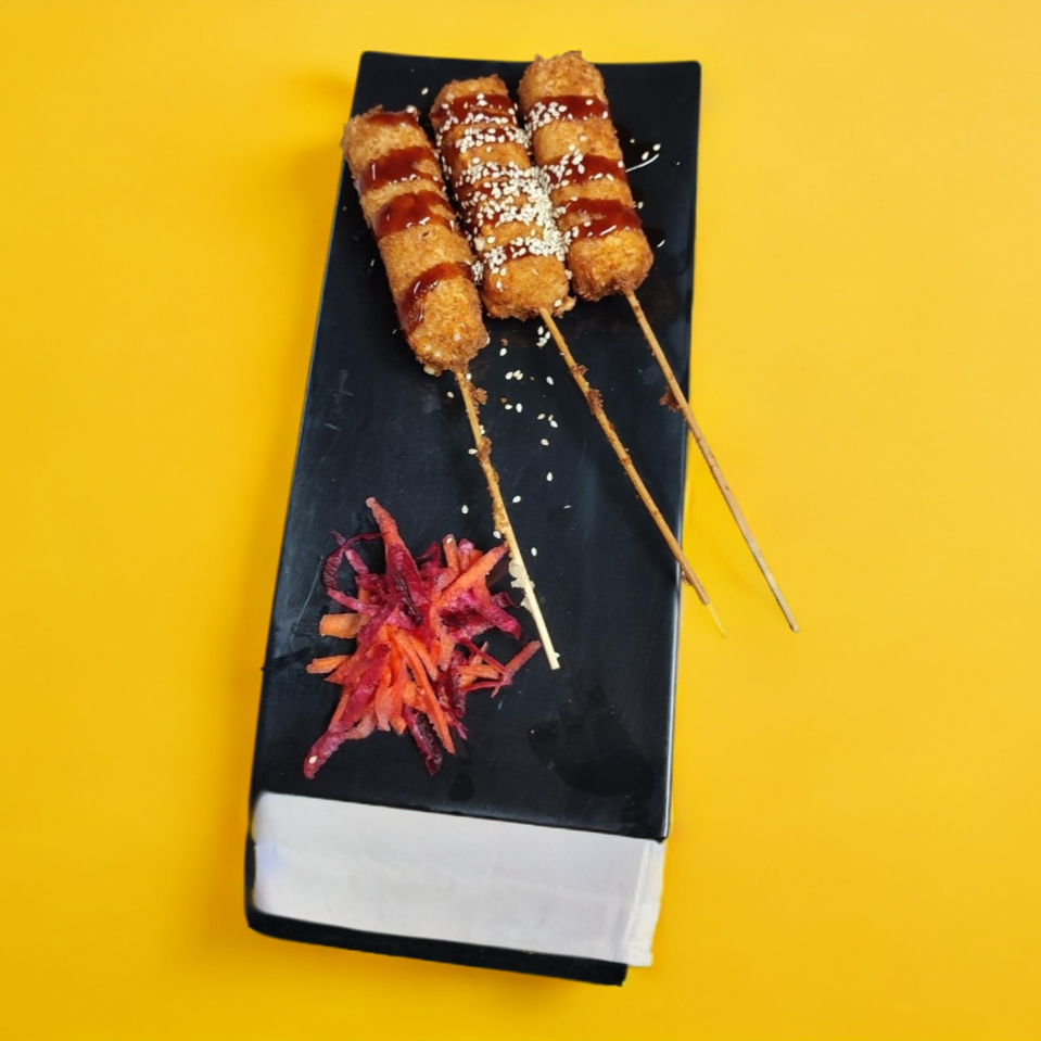 Kanikama, camarón, pepino, mango, siracha togarachi y limón con salsa especial.