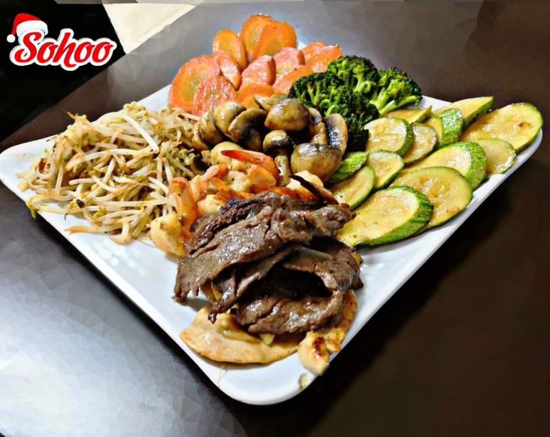 Teriyaki Sohoo de Pollo, Res & Camarón.