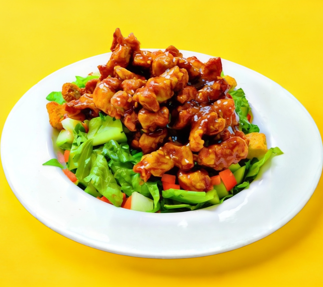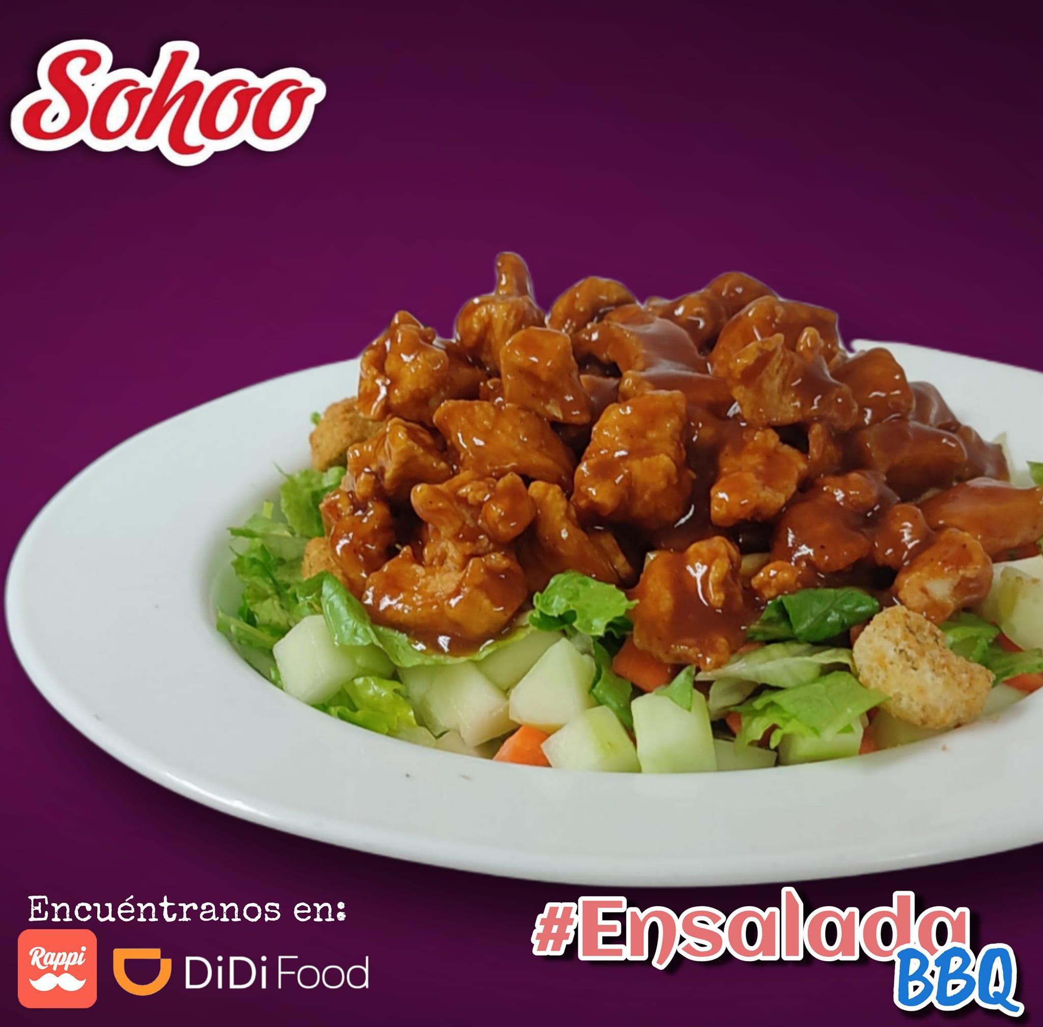 Rica pechuga de pollo marinada en salsa bbq acompañada de lechuga, zanahoria y pepino.
