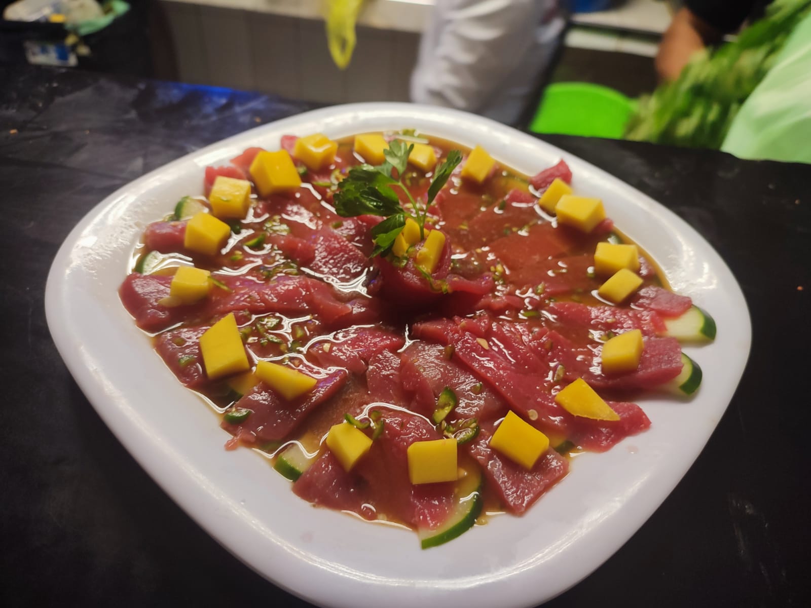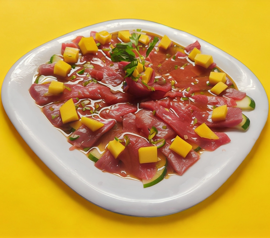 Una rica mezcla de atún y mango con cebolla morada y clamato especial al chiltepín.