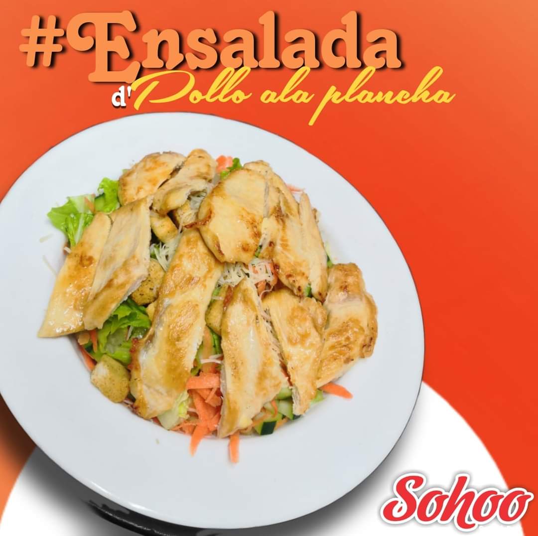 Rica pechuga de pollo a la plancha acompañado de lechuga, zanahoria, queos Chihuahua y crutones.