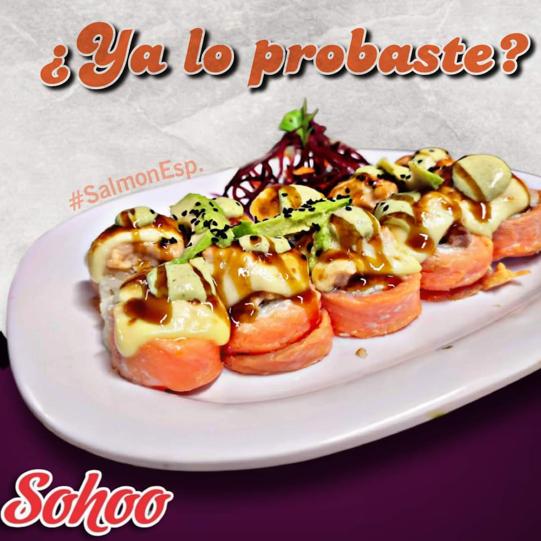 Tampico, salmón spicy gratinado, bañado en salsa de anguila y salsa de cilantro con ajonjolí blanco.