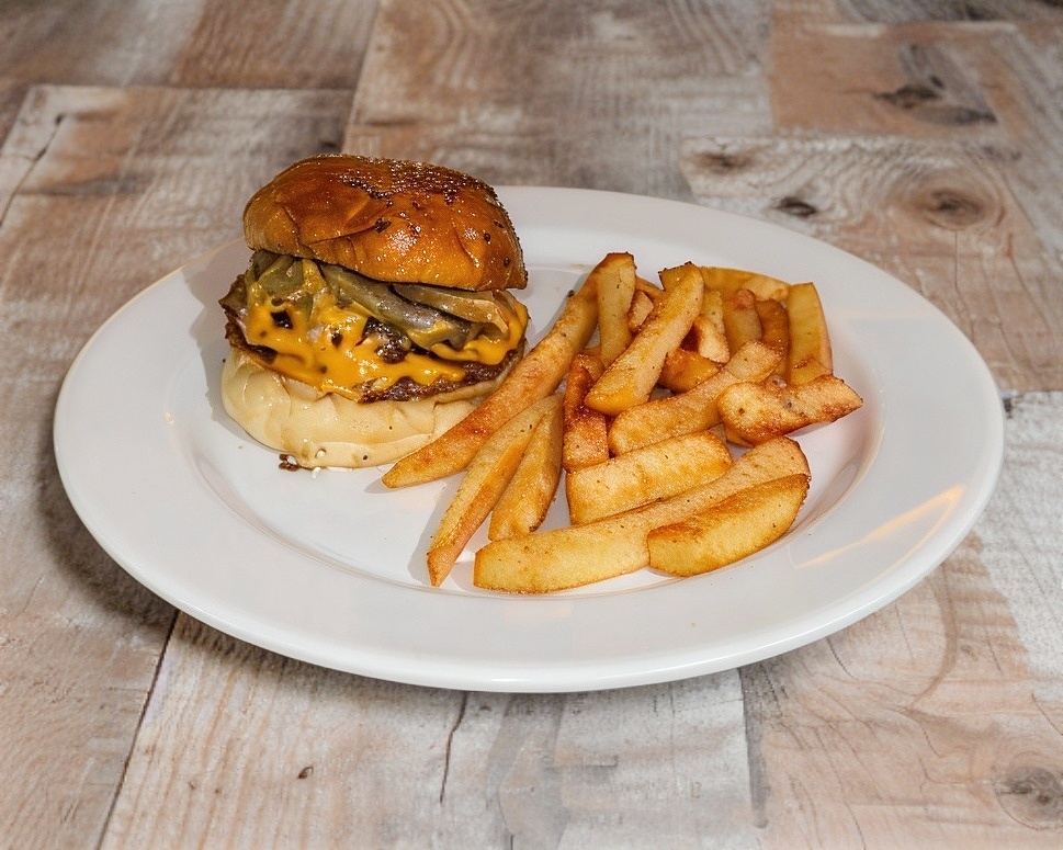 120gr de Rib eye, queso americano, aros de cebolla y tocino bañado en salsa BBQ. Acompañado de papas a la francesa.