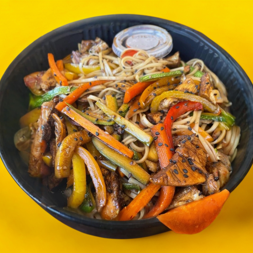 pasta tipo ramen, vegetales y pollo salteados con salsas orientales.
