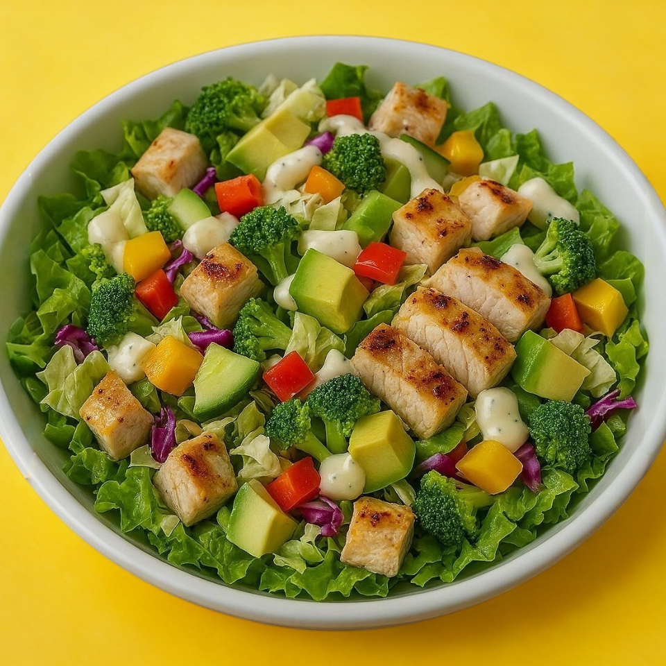 lechuga, col, brócoli, pimientos, pepino, aguacate, pollo a la plancha y aderezo.