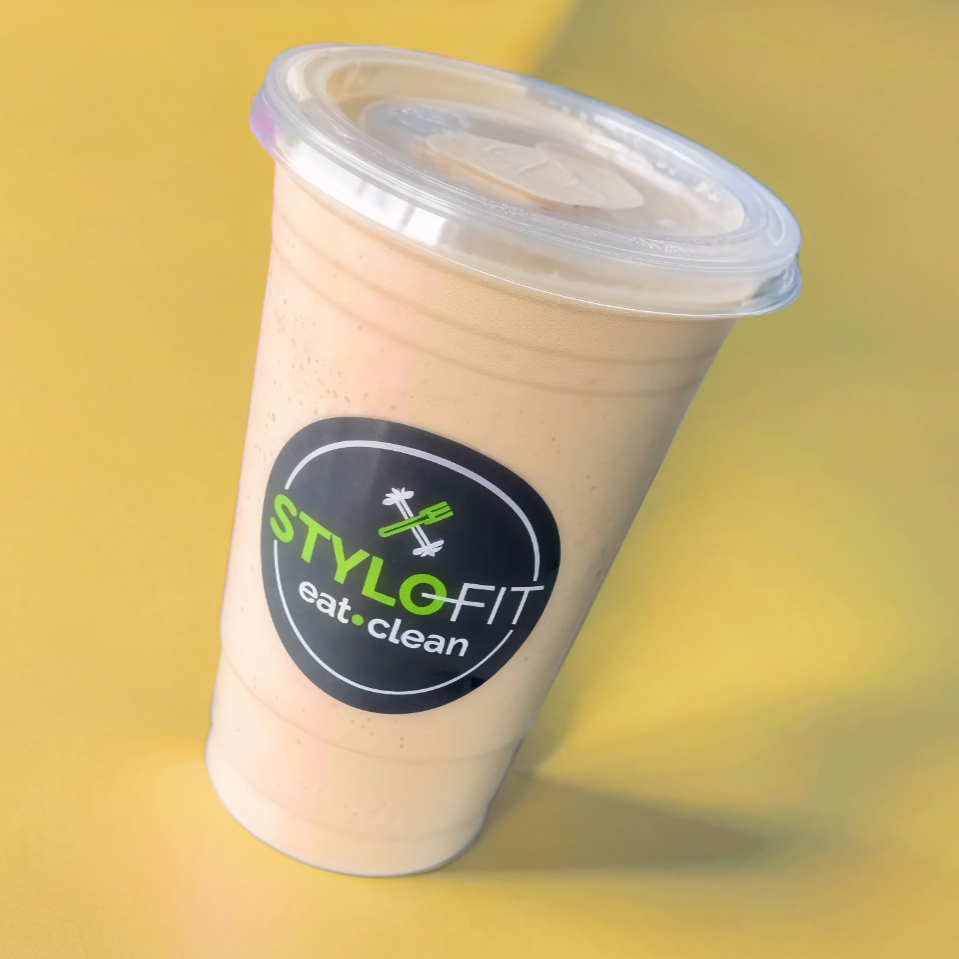 delicioso smoothie de platano y crema de cacahuate, cafe, hielo y leche.