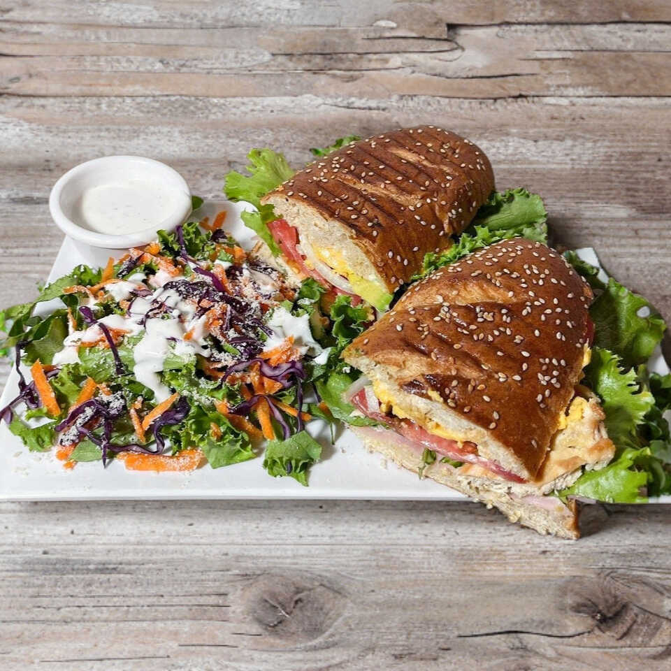 con pan integral, pechuga de pollo, jamon, queso americano, lechuga, tomate, cebolla, y aguacate.
