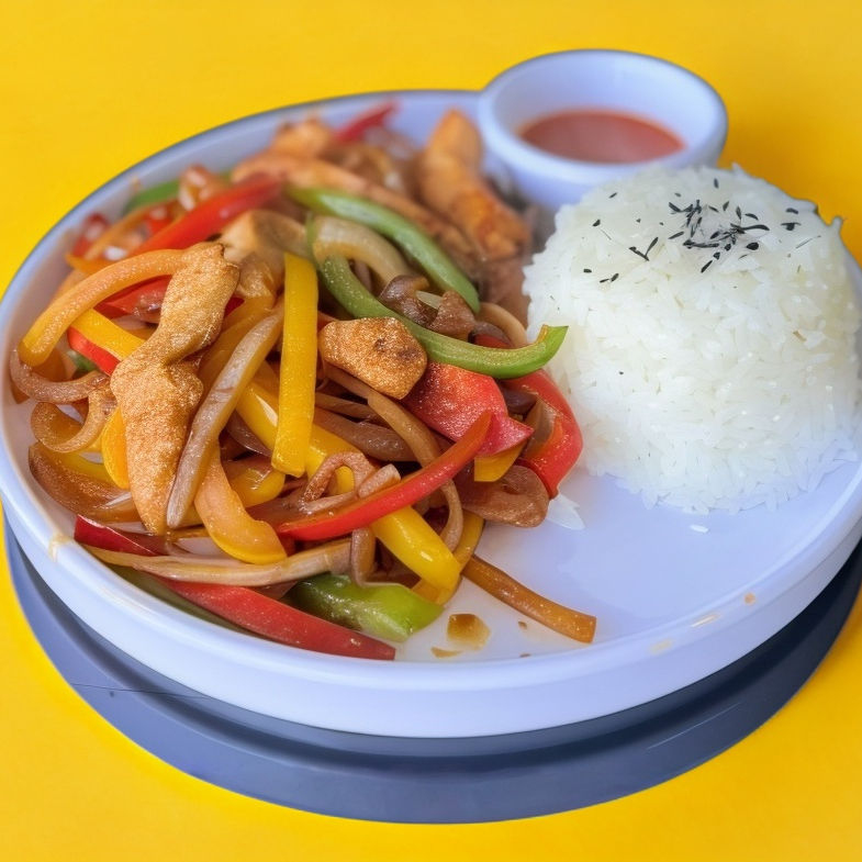 fajitas de pollo y pinientos acompañados con arroz al vapor