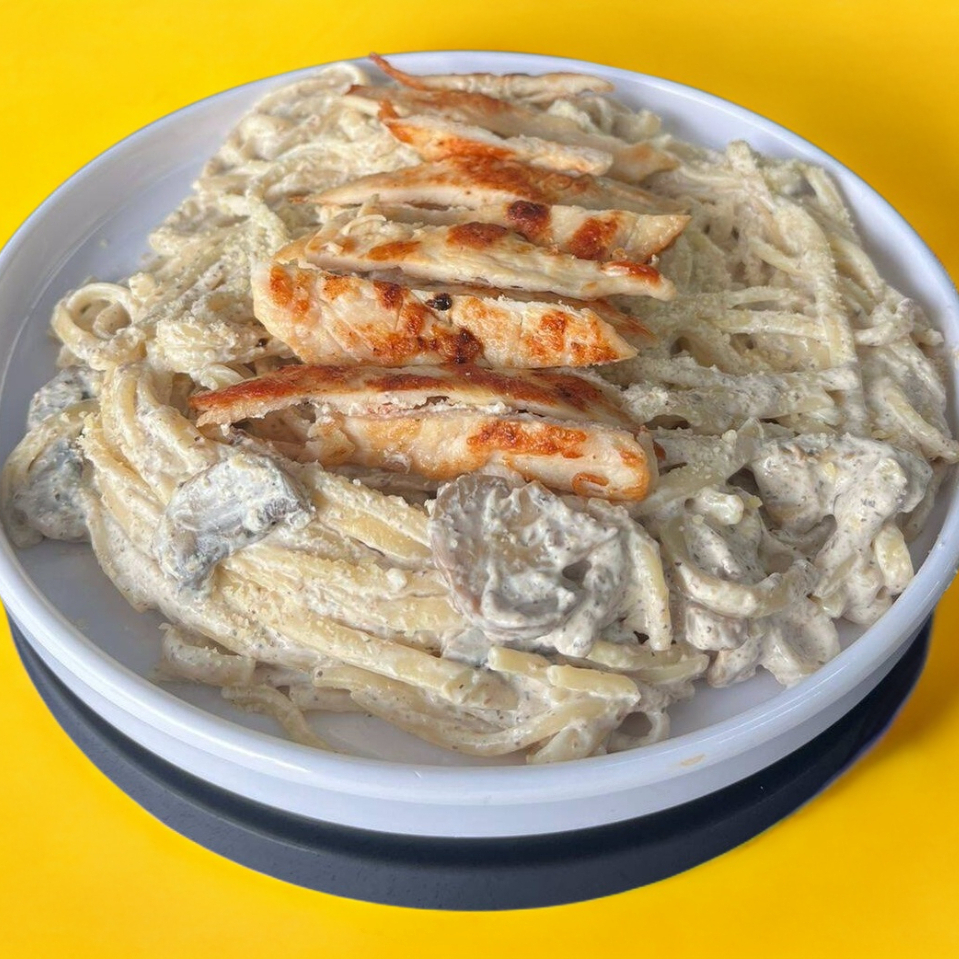 fetuccini con pollo bañado en crema de champiñones.