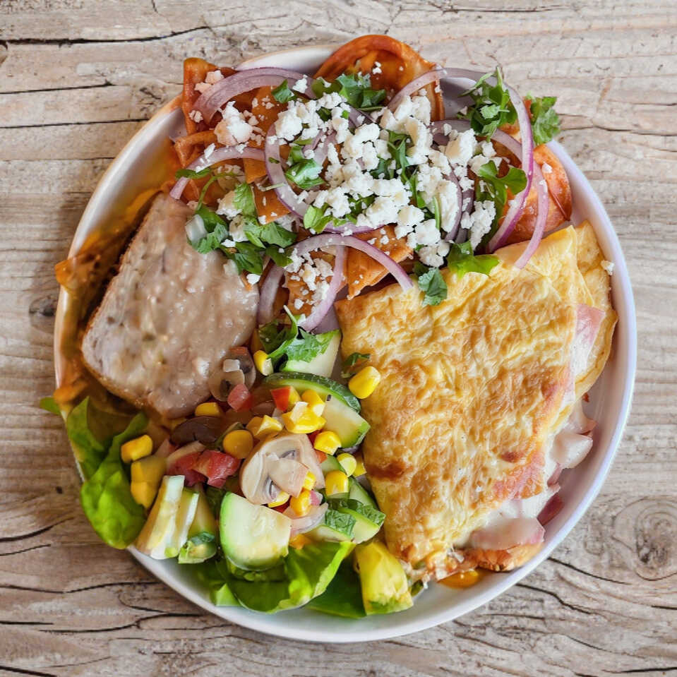 por dentro pollo desmenuzado, bañadas en salsa roja, acompañadas de ensalada fresca y aguacate.