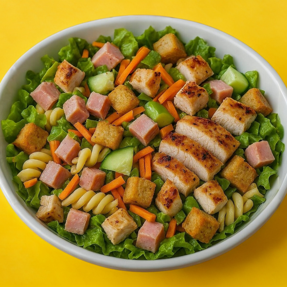 lechuga, jamón, pasta, zanahoria, pepino, crotones, pollo a la plancha y aderezo.
