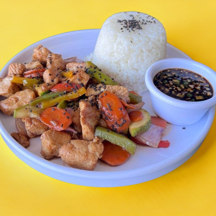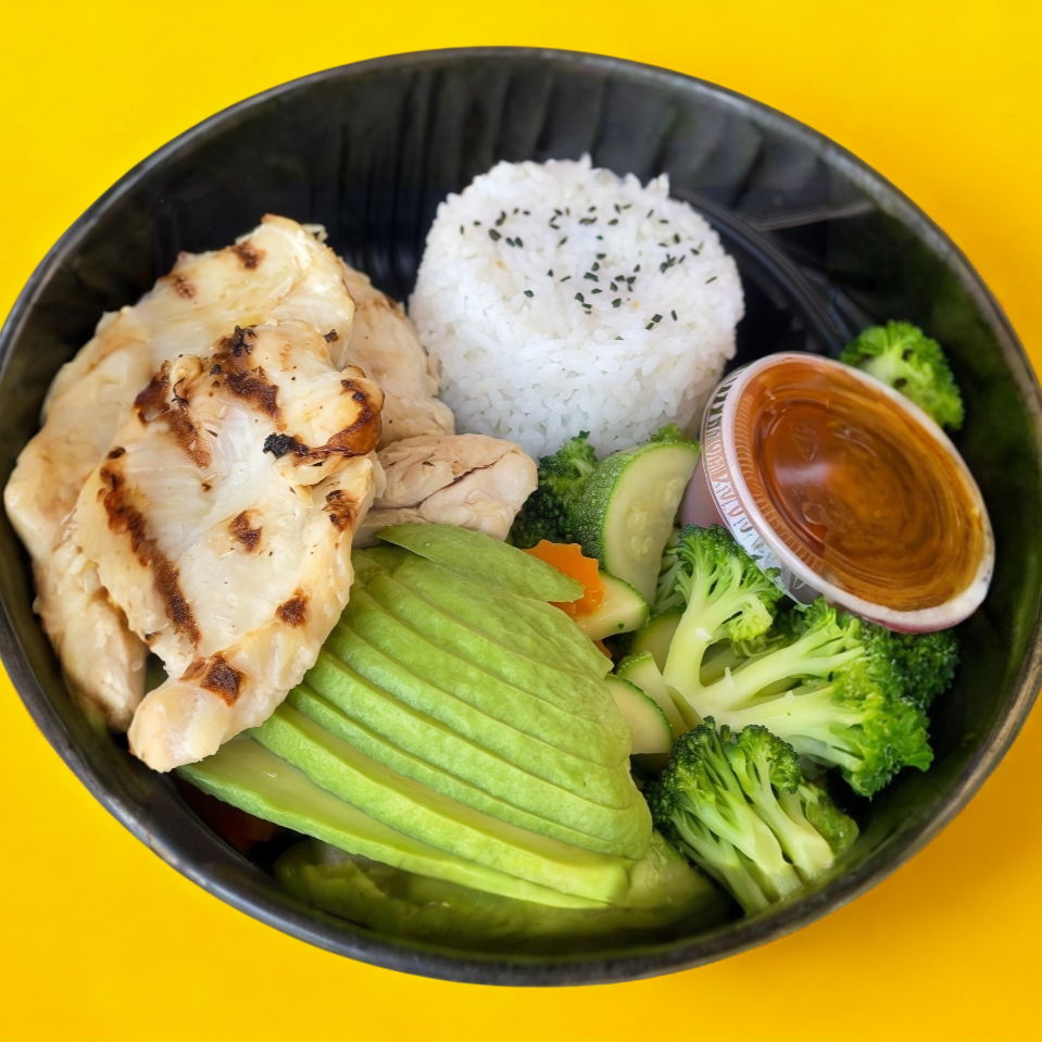 pechuga de pollo a la plancha acompañado de pasta natural, salteado de verduras teriyaki, aguacate y salsa.