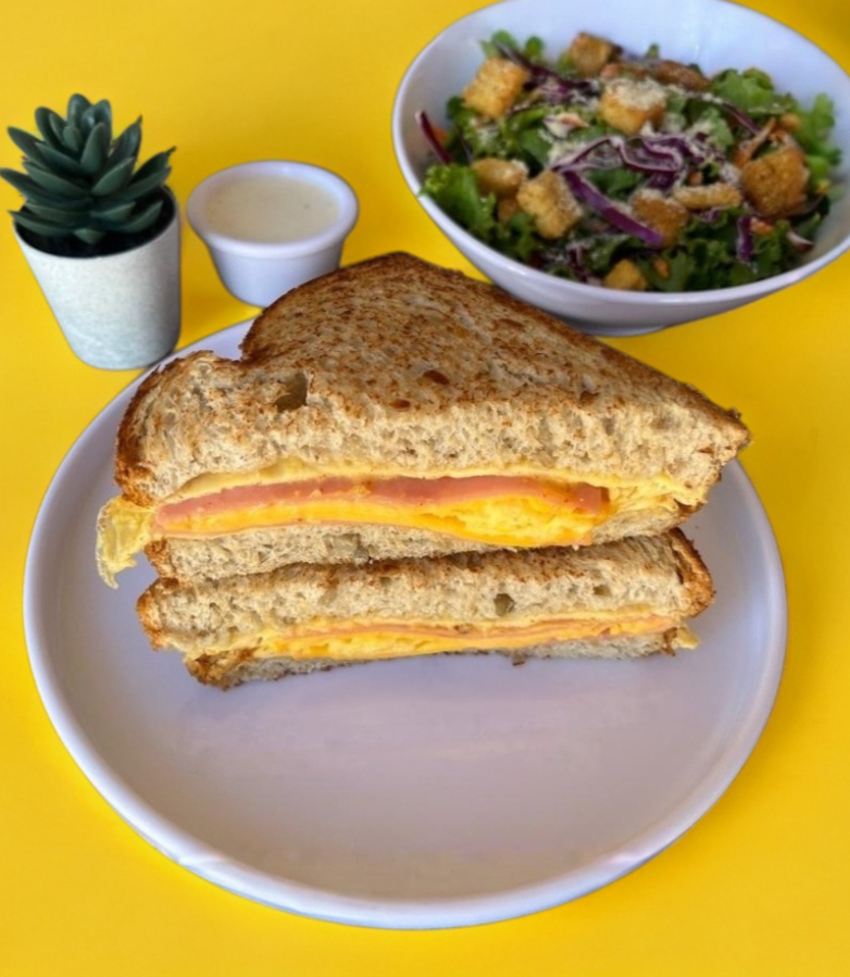 pan dorado en la parrilla,jamon, queso americano, lechuga,tomate, cebolla, y aguacate