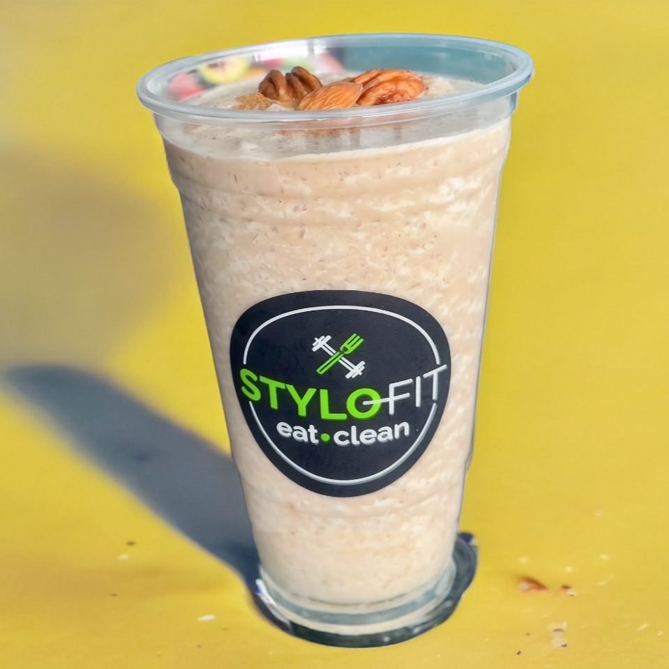 delicioso smoothie de platano, miel,avena, cacao, hiuelo y leche.