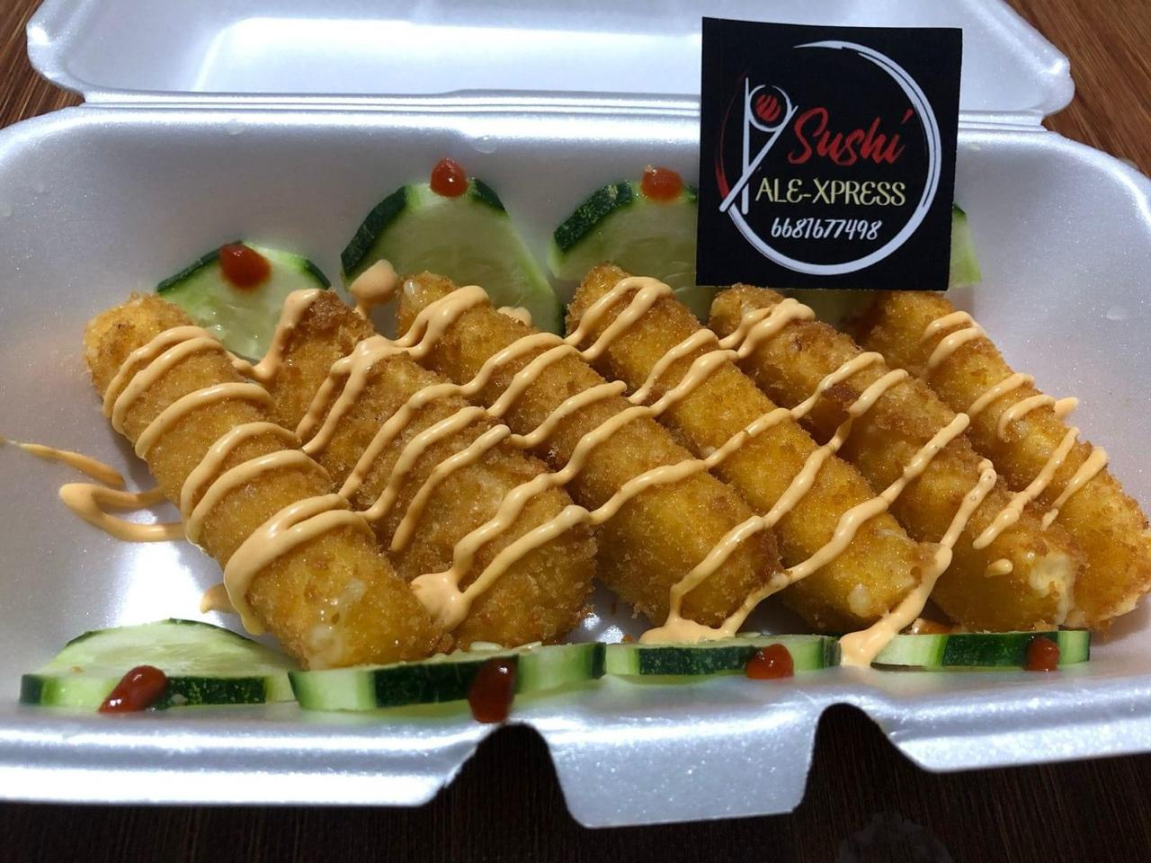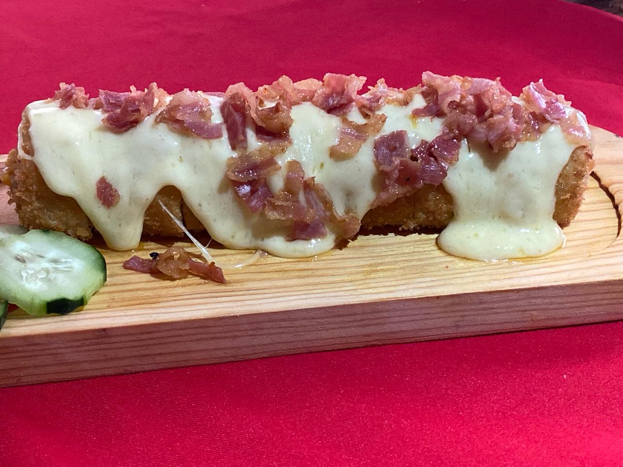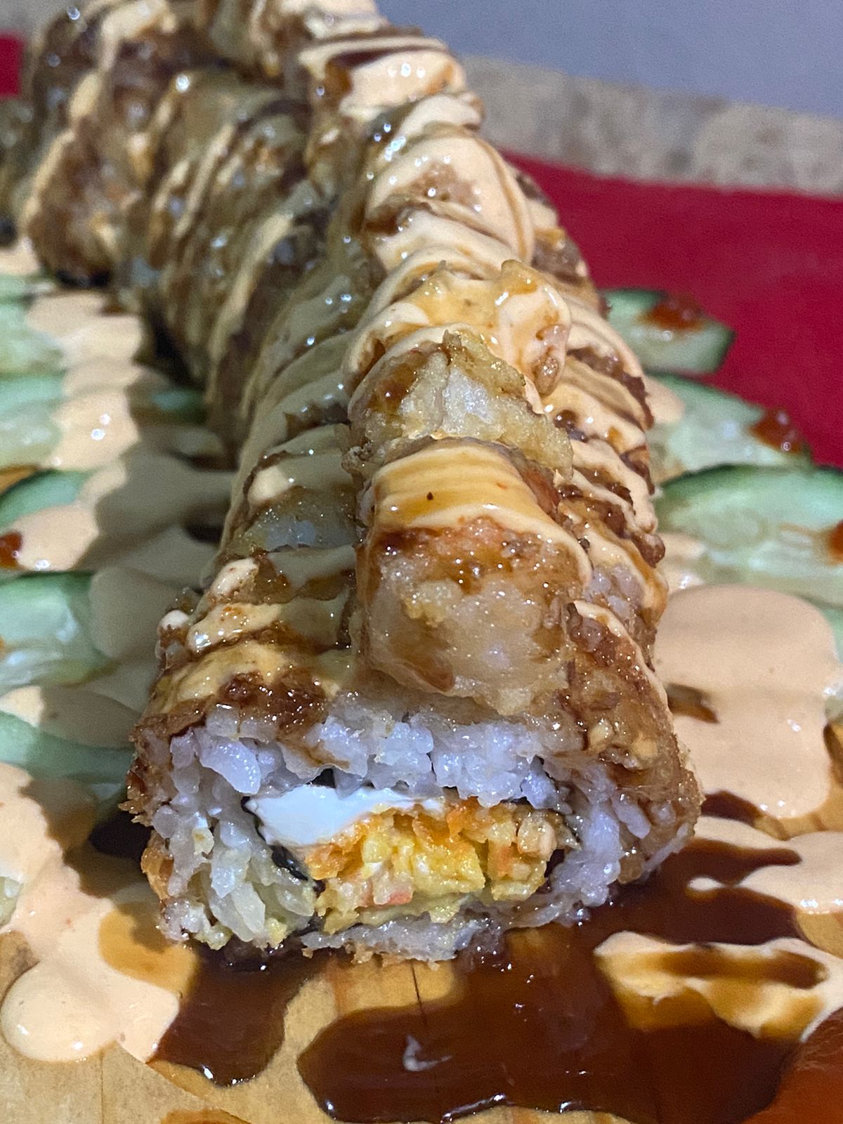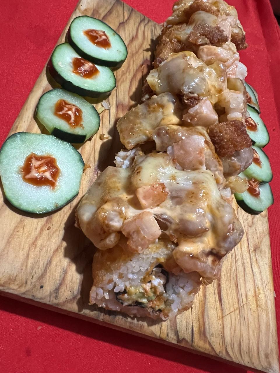 Relleno de ensalada surimi, Philadelphia y aguacate, con cobertura de queso chihuahua con trozos de tocino frito, bañada con aderezo de la casa y de anguila, acompañados de pepino y salsa soya