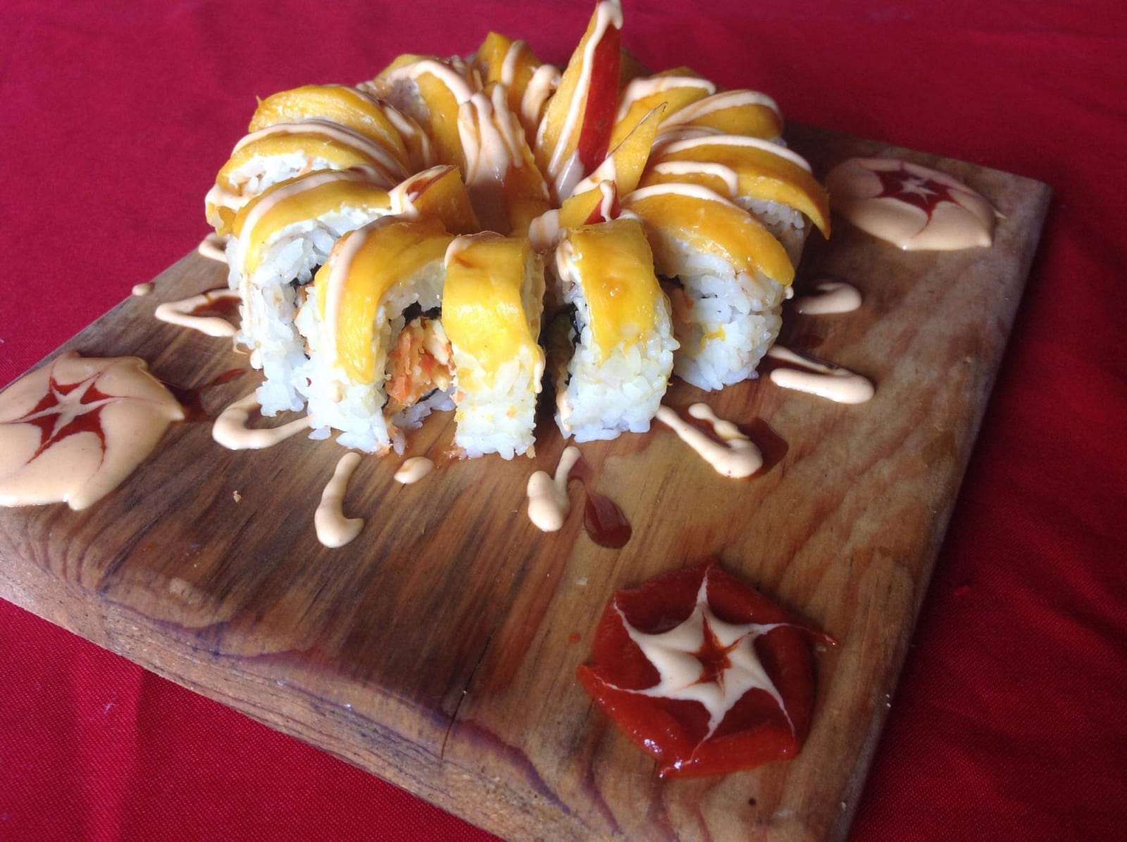 Relleno de ensalada surimi, Philadelphia y aguacate,por fuera una cubierta de pulpa de mango, bañadas con aderezos de la casay de anguila, acompañado de pepino y salsa de soya