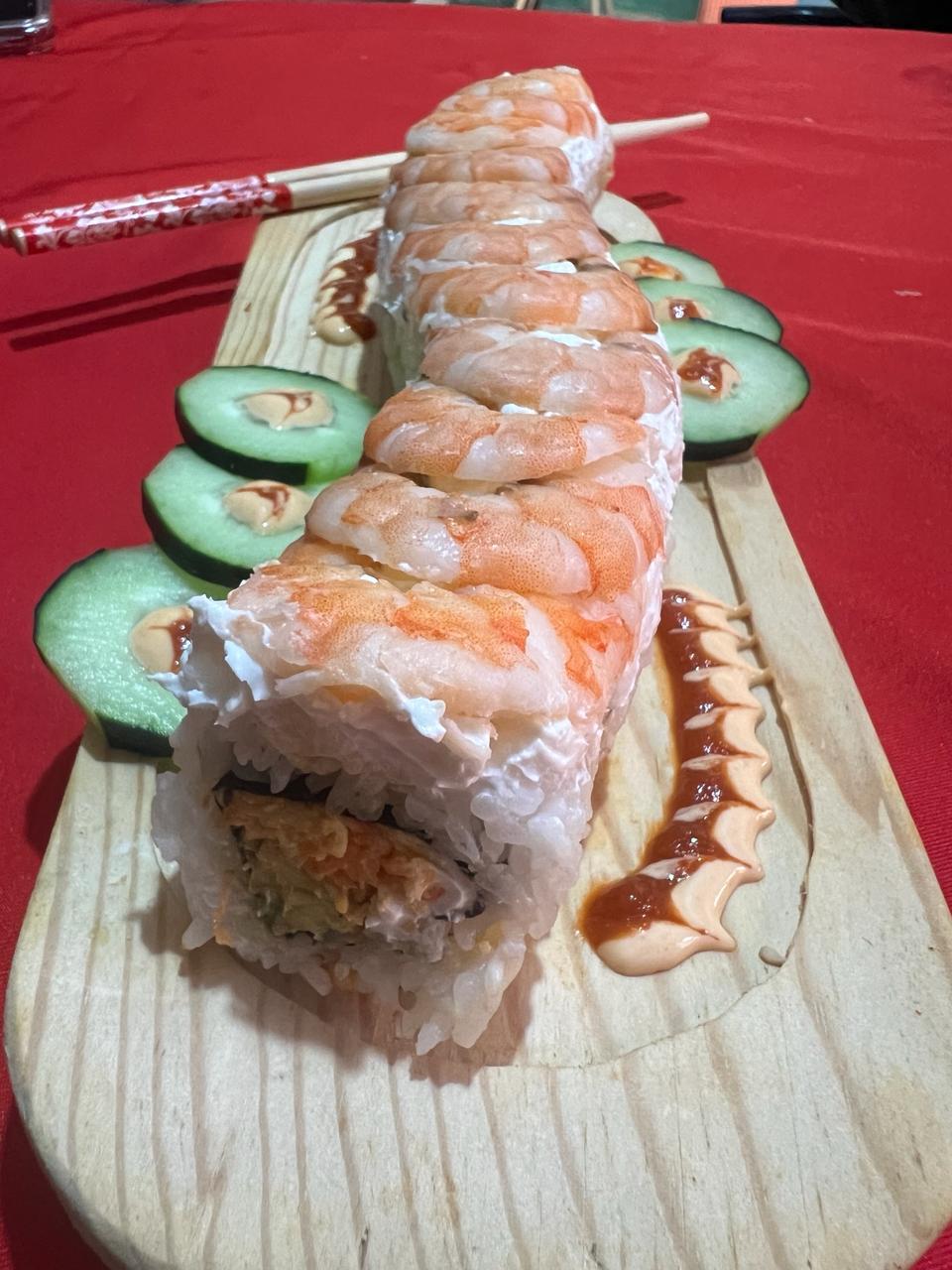 Relleno de exquisita ensalada surimi, Philadelphia y aguacate, parte superior cubierta de camarones cocidos, bañados con aderezos de la casa y de anguila, acompañado de pepino y salsa de soya