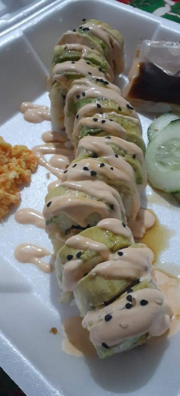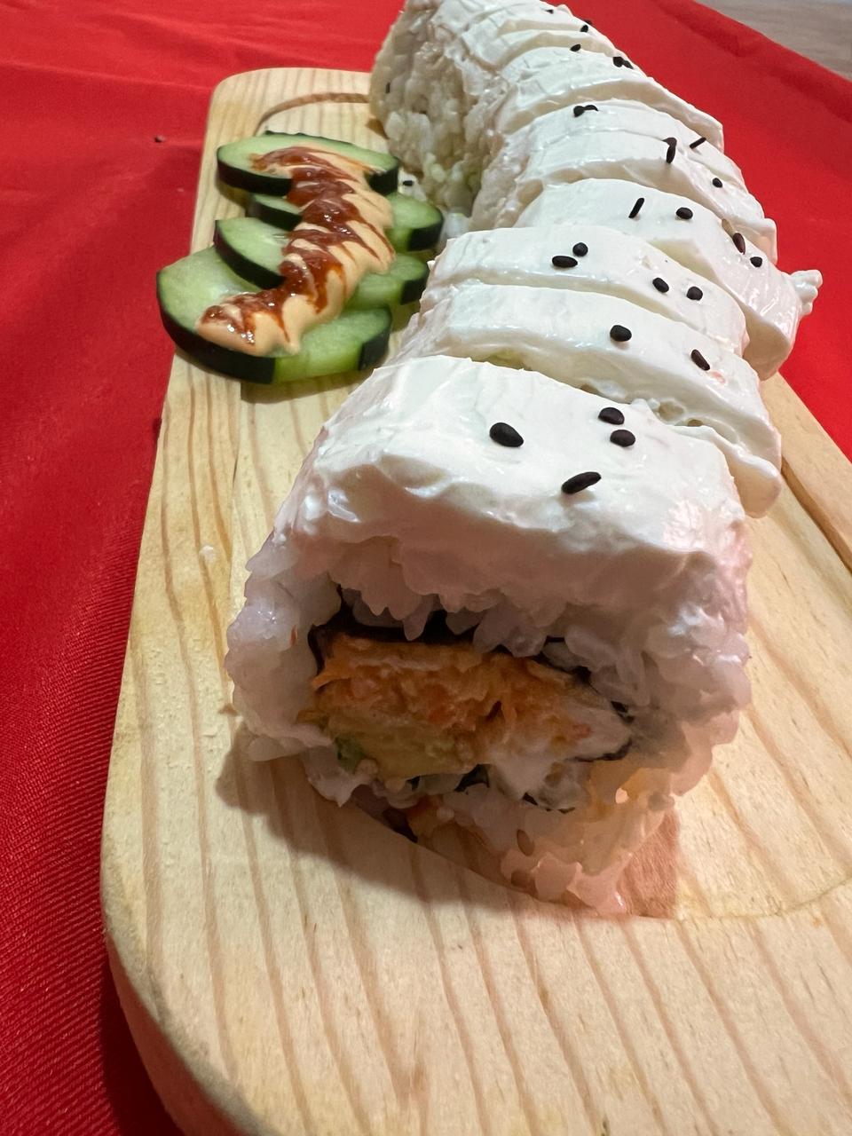 Relleno de camarón empanizado, Philadelphia, queso chihuahua y aguacate en la parte superior una capa de ensalada surimi, bañada con aderezos de la casa y salsa anguila, acompañados de pepino y salsa soya