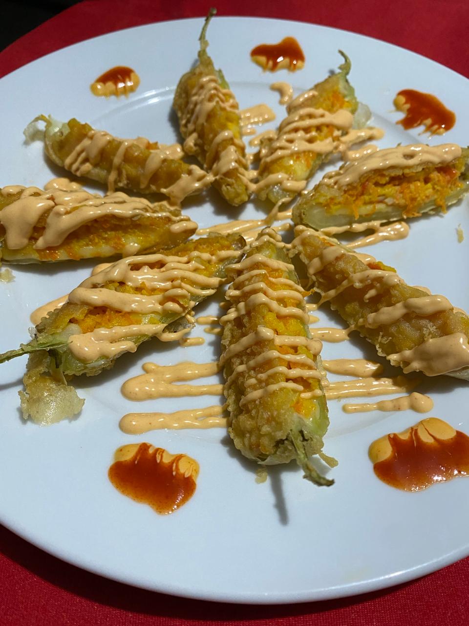 Chiles caribe rellenos de Philadelphia, ensalada surimi, empanizados en tempura acompanados de aderezo de la casa 4 Pz