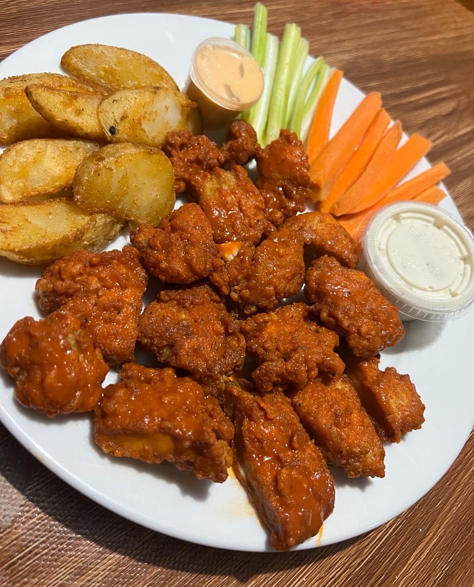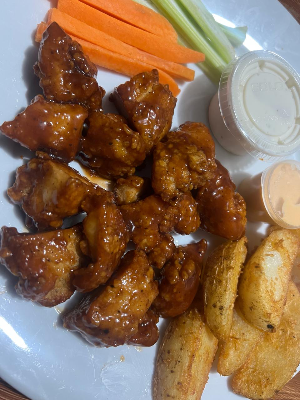 Pollo crujiente, bañado en salsa de tu eleccion, acompañado con papas sazonadas, bastones de apio y zanahoria, incluye aderezo de chiplote y ranch 150 gr