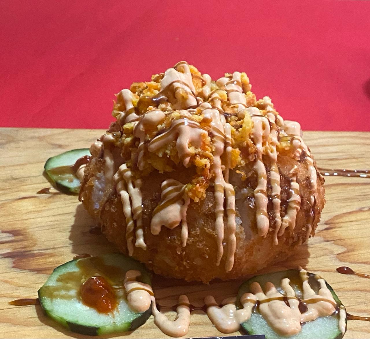 Relleno exquisito de ensalada surimi, Philadelphia y aguacate en la parte superior crotones de pollo crujiente 40gr, camarón empanizado 40gr y carne de res 30gr, gratiando de queso chihuahua al horno, bañado con aderezos de la casa y salsa anguila, acompañada de pepino y salsa de soya