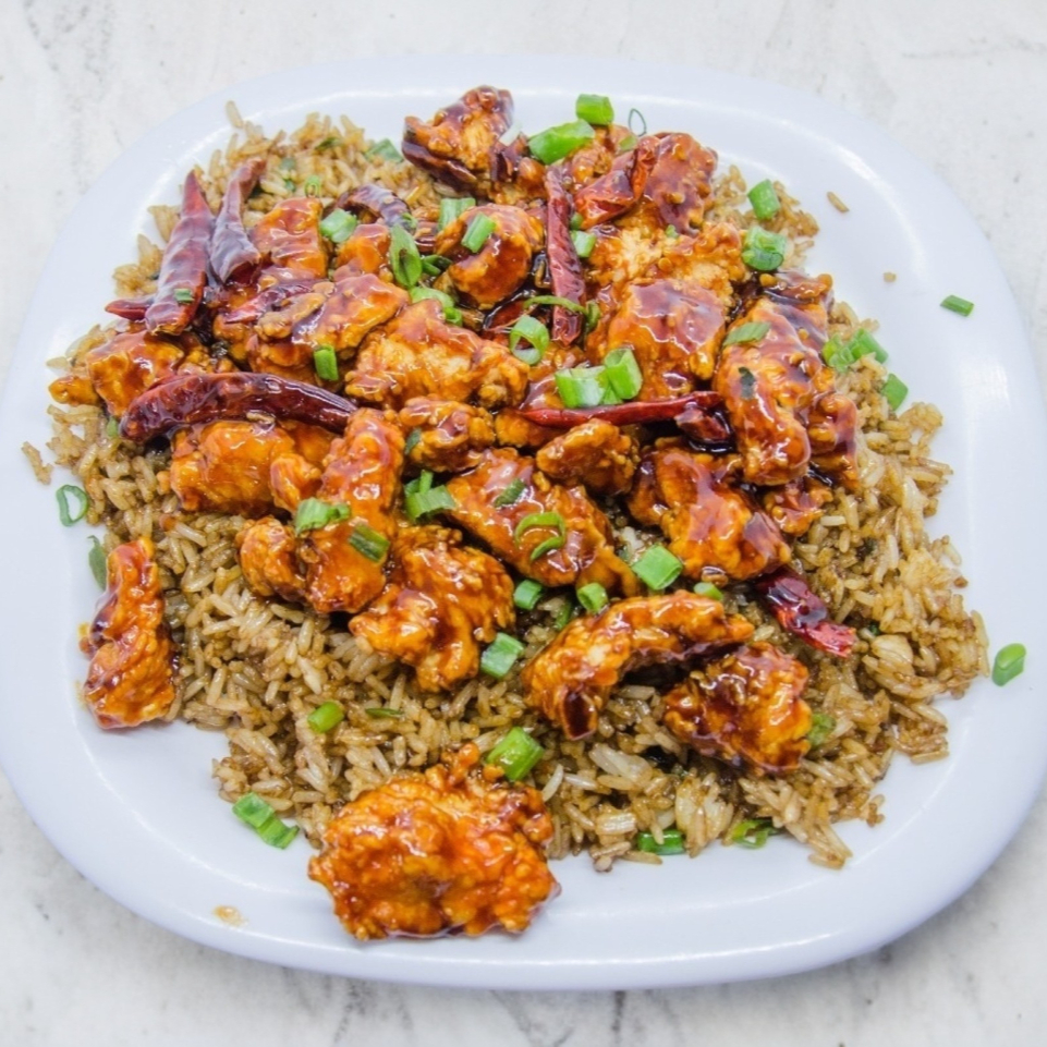 Pollo Capeado con Vegetales en salsa Agridulce de la casa con cama de arroz blanco