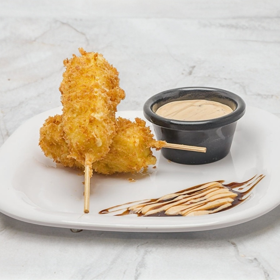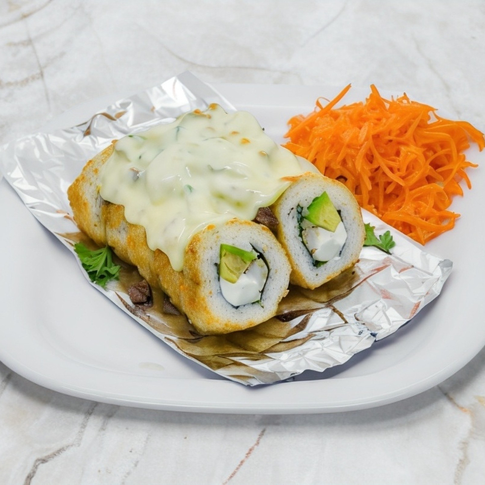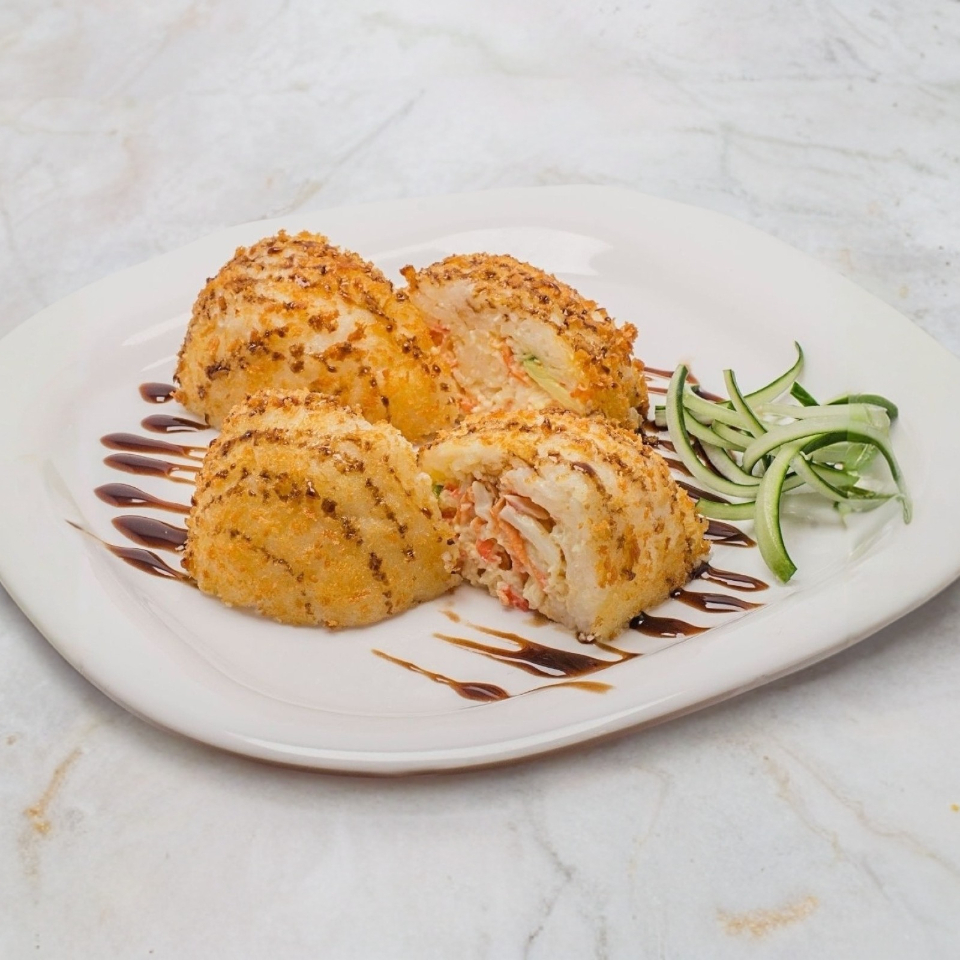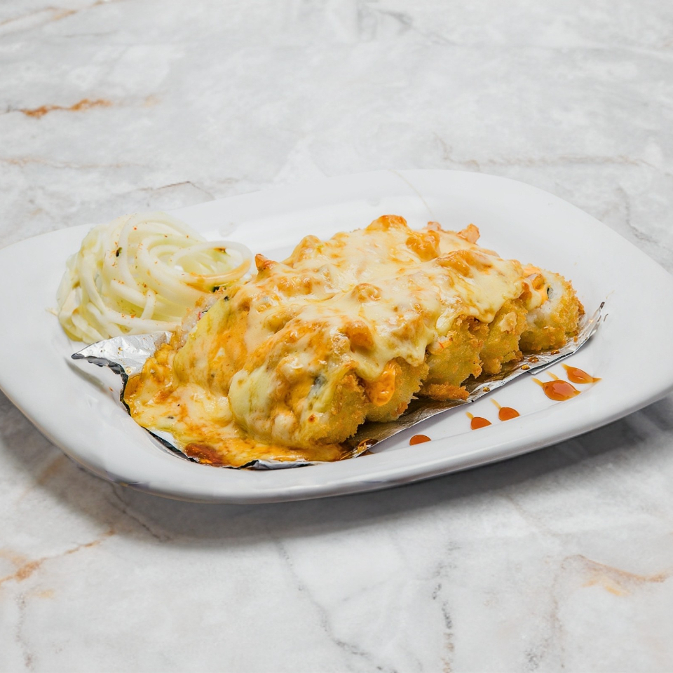 Rollo Empanizado al Horno de camaron con carne asada, cebollita, caribe y Queso Gratinado
