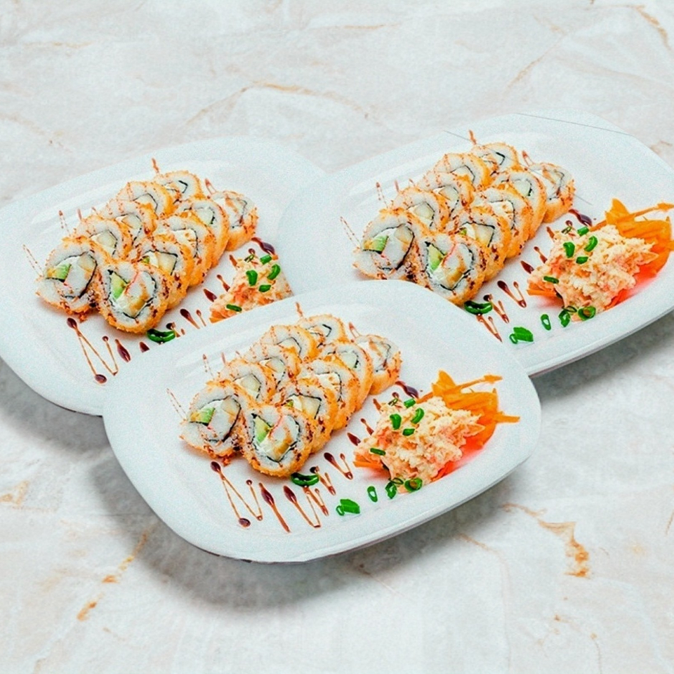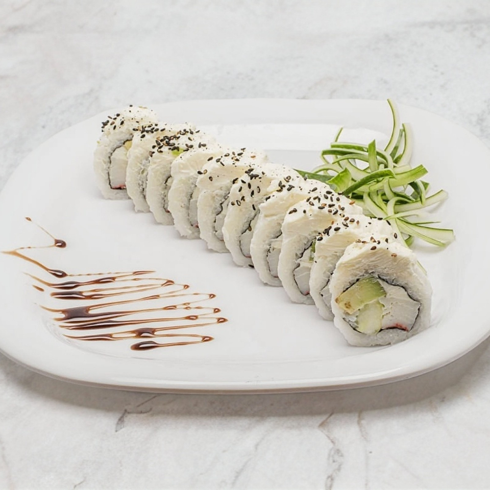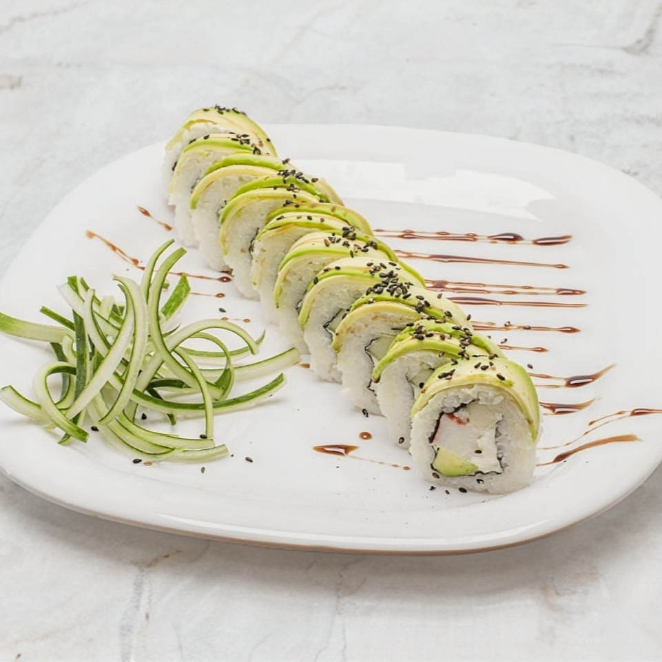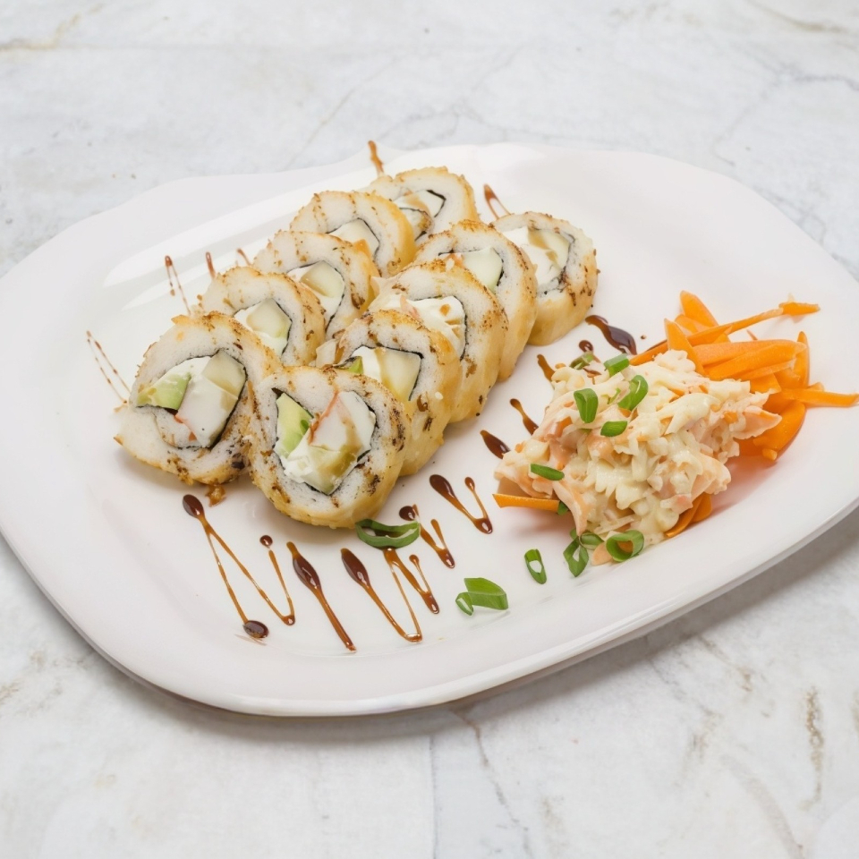 Rollo natural de camarón empanizado, philadelphia, aguacate y kanikama arriba, con salsa agridulce.