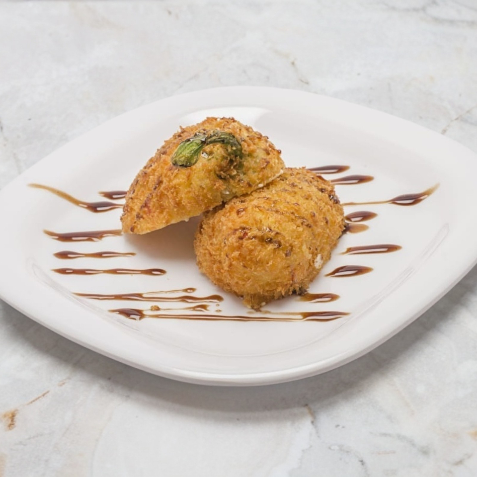 Bola de arroz rellena de tampico y camarón, con queso gratinado, tocino y aderezo arrriba