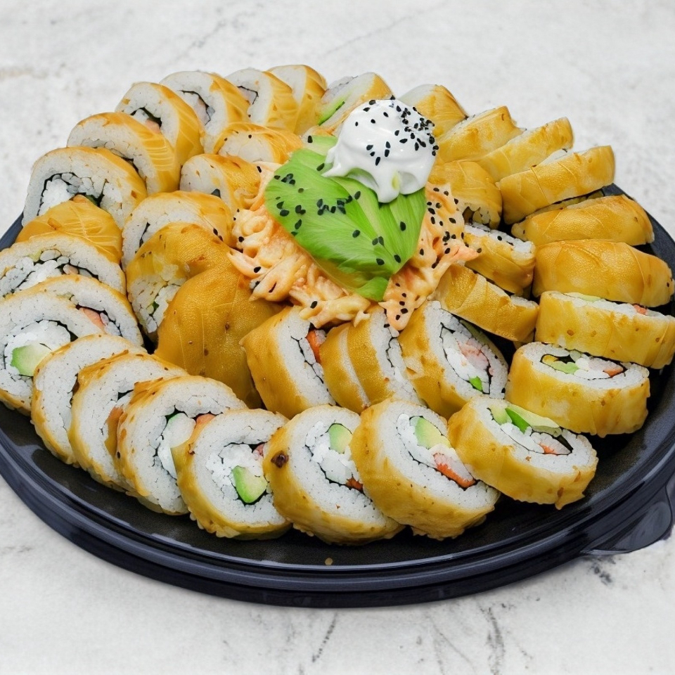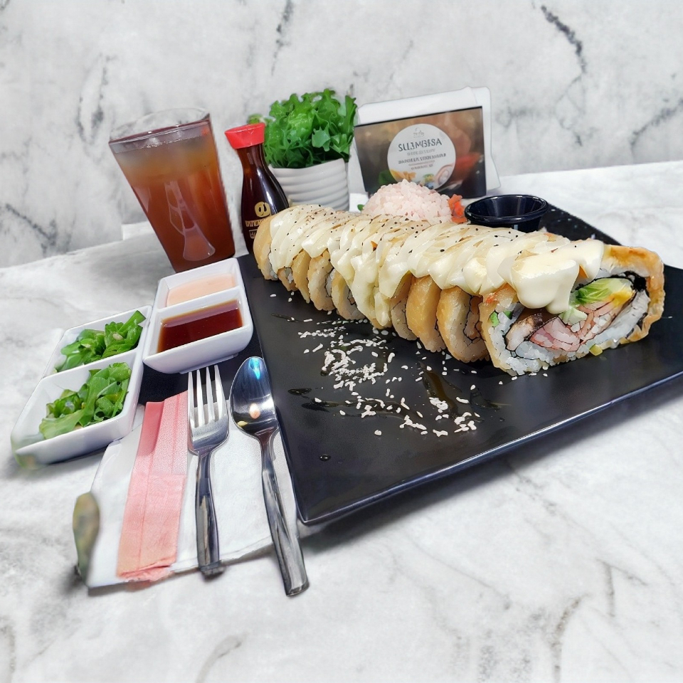 Sushi Gigante para 2 Personas relleno de camaron, res y pollo con tampico y queso gratinado