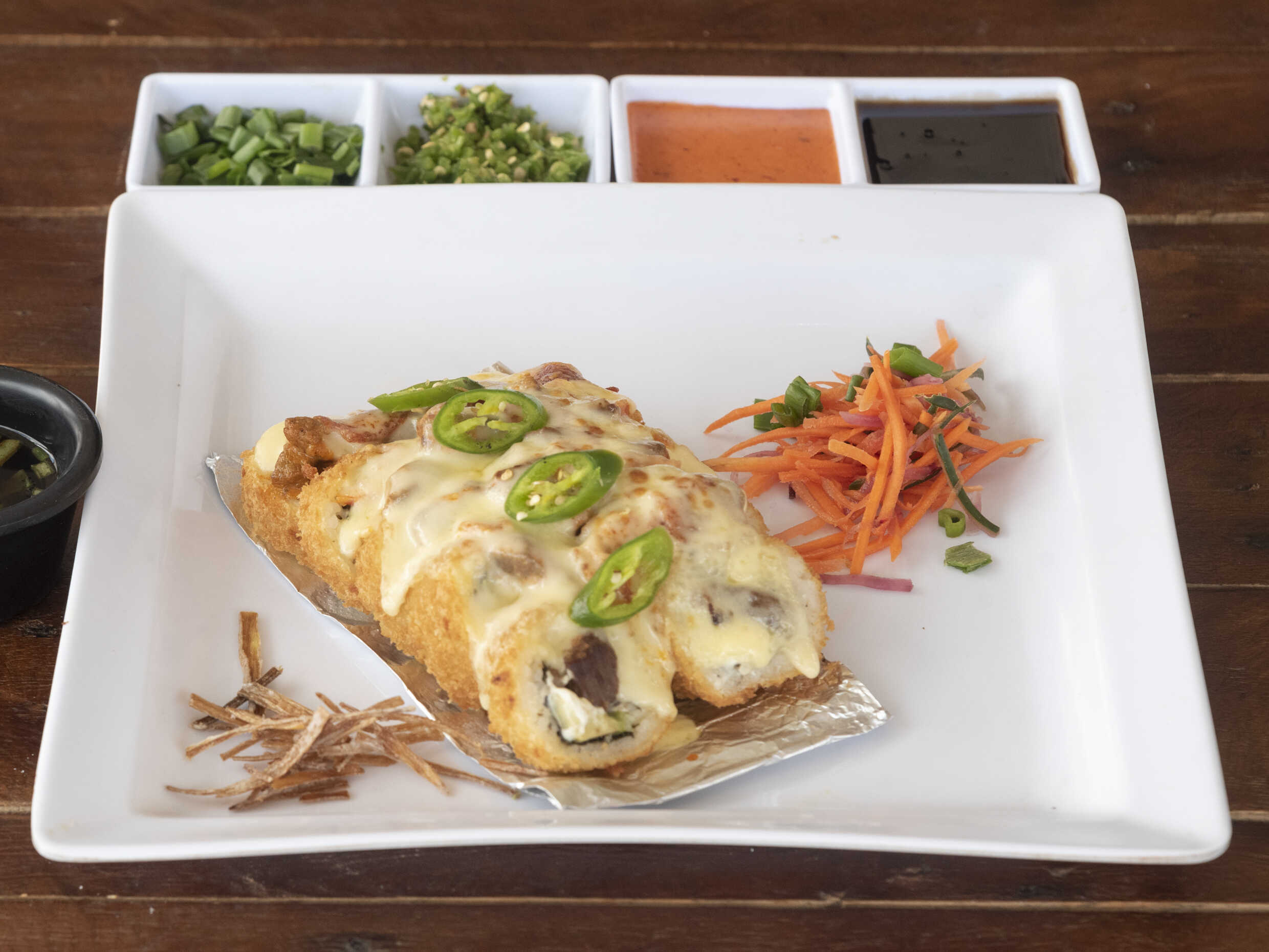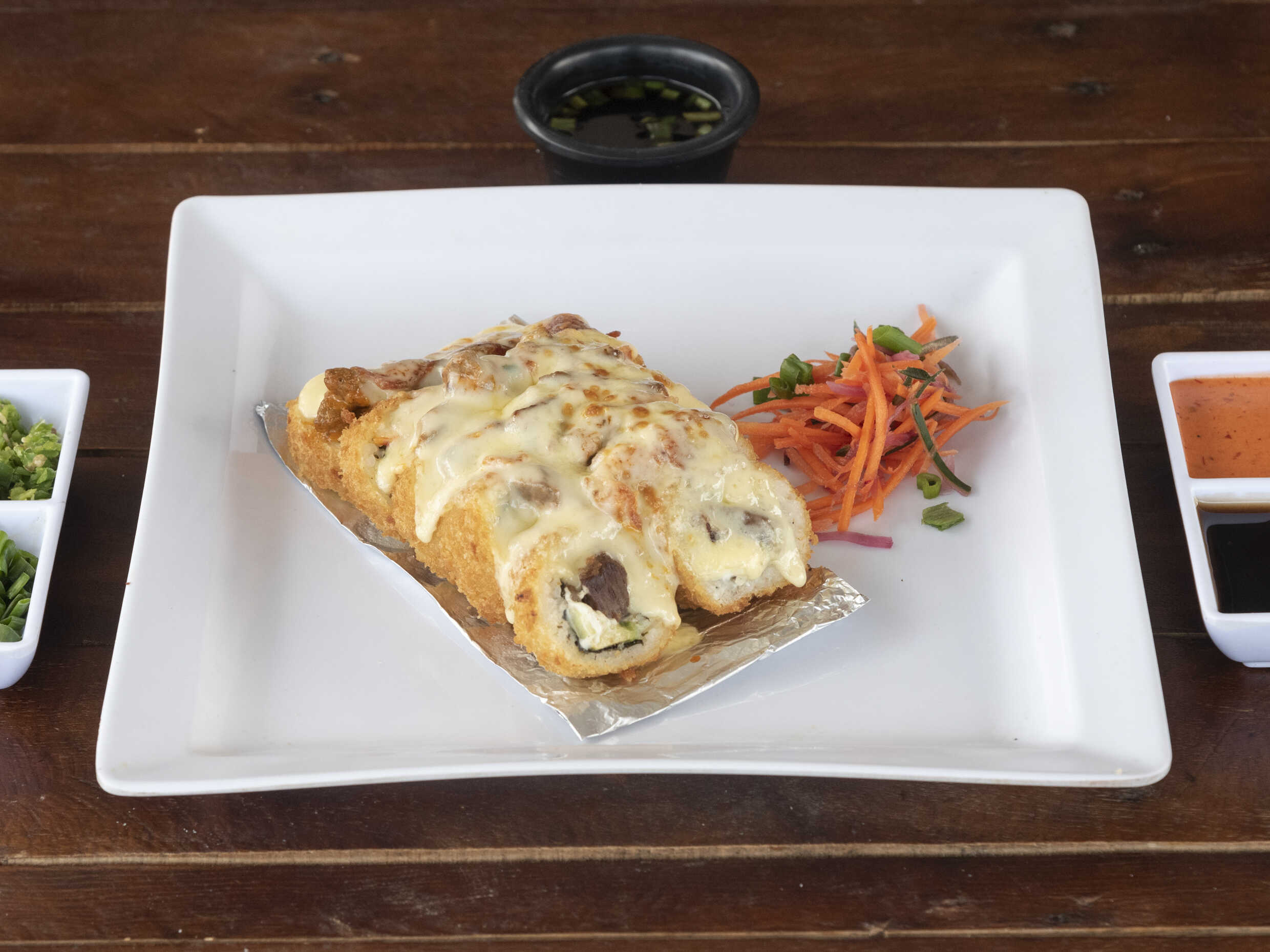 Rollo empanizado relleno de queso crema, aguacate, pepino y pollo. Gratinado y coronado con res y tocino.