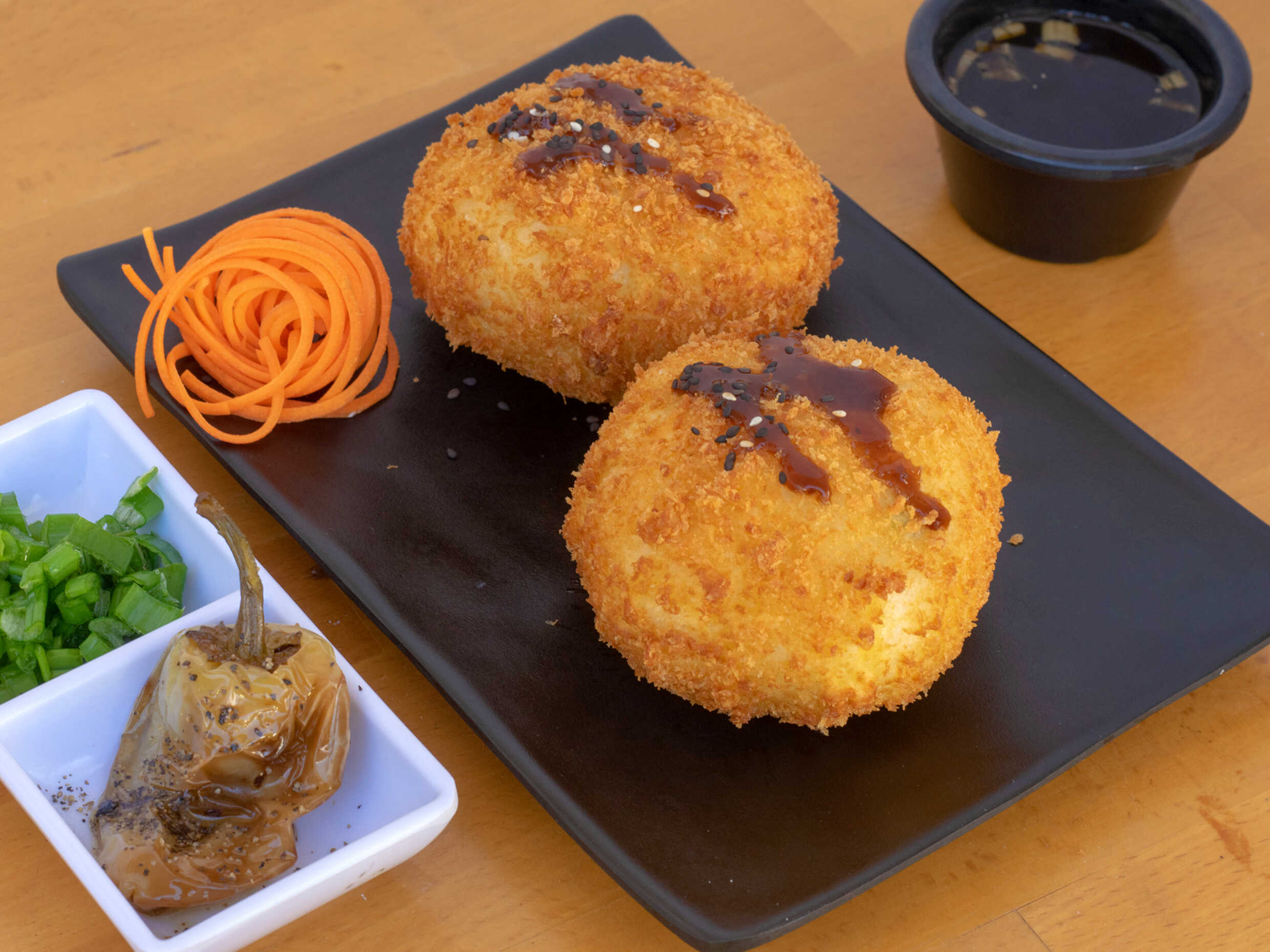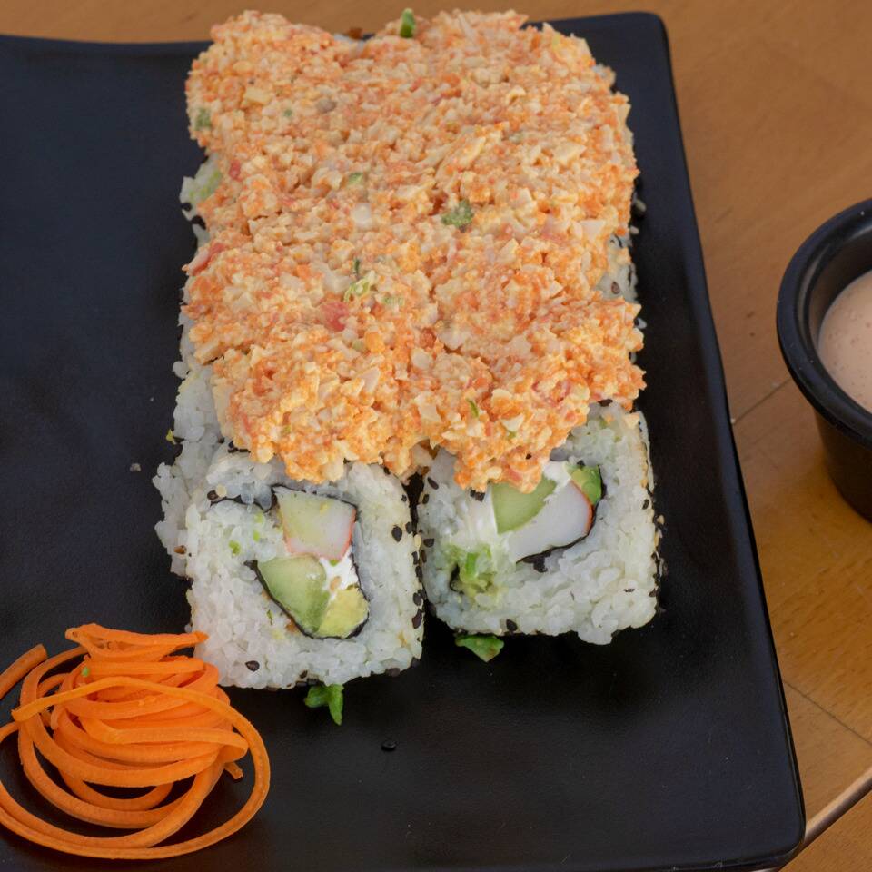Rollo empanizado relleno de queso crema, aguacate, pepino y surimi. Coronado con kanikama mayo-spicy y camarones empanizados bañados en salsa de anguila