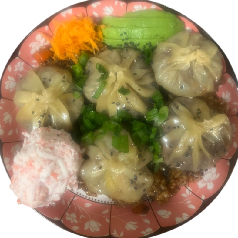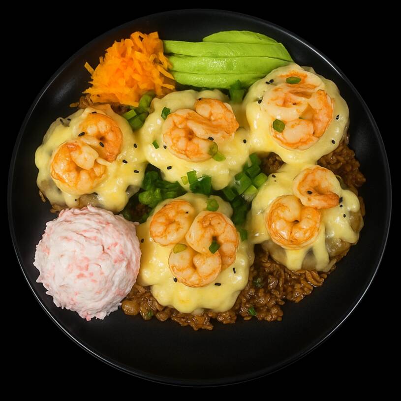 Cama de arroz frito, bola de tampico, aguacate, zanahoria y con 5 dumplings gratinados de queso y coranados con camarones fritos
