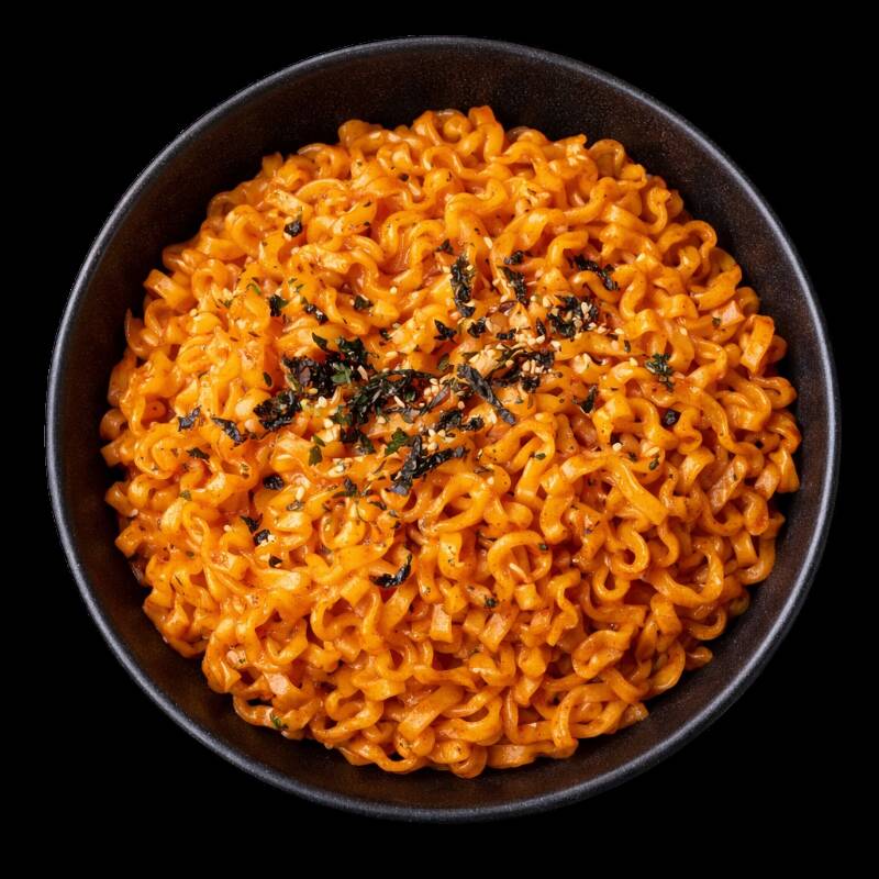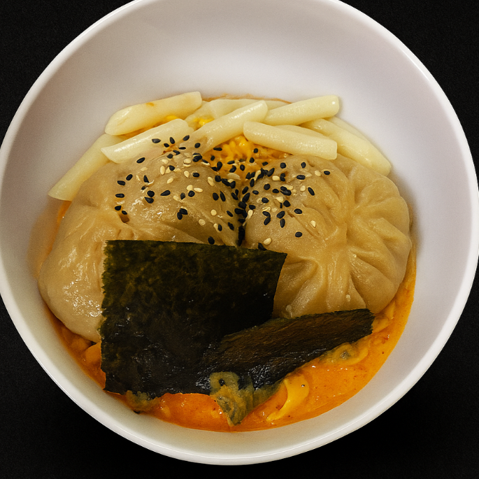 Un Ramen picante, preparado con ajonjoli, alga, 2 dumplings rellenos a su elección y trozos de pastel de arroz coreano.