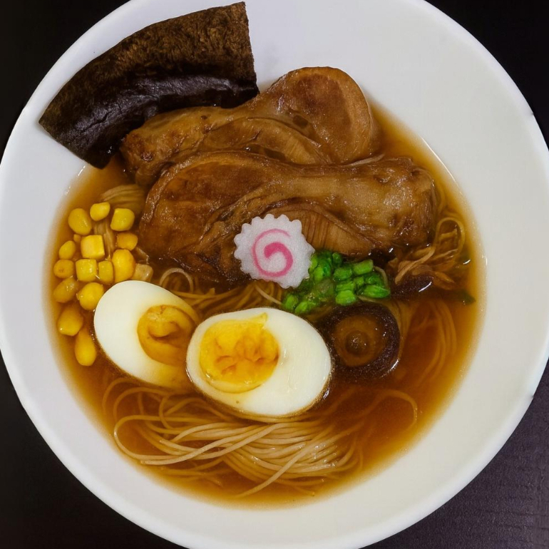 Caldo a base de cerdo y res, 3 dumplings, pasta de harina de huevo, naruto, cebollín, huevo, elote y alga.