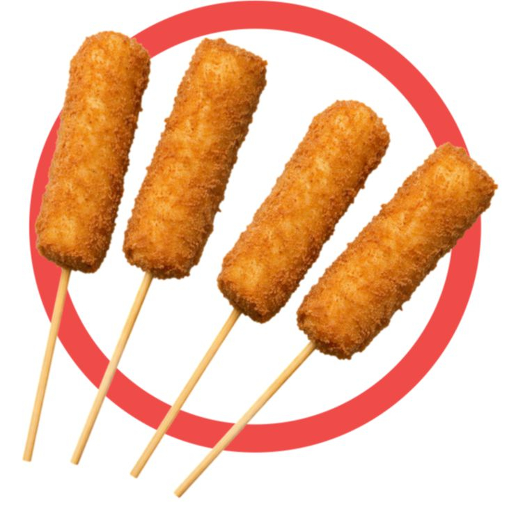 4 takoyakis, 3 dumplings, 4 salchipulpos, 1 onigiri relleno de queso crema y surimi