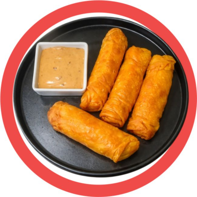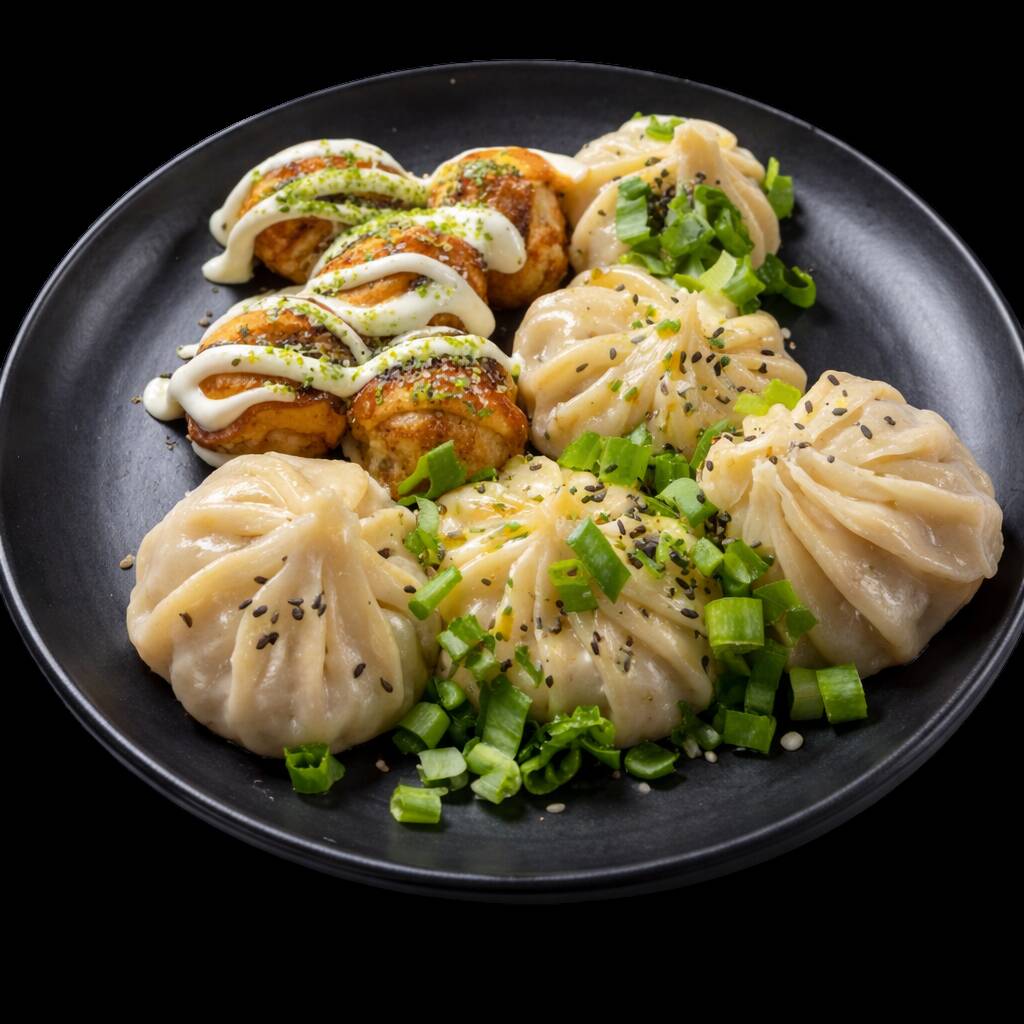 5 Trozos de masa rellenos de carne de res y cerdo sazonados, 5 Bolitas de masa fritas con rellenos a elegir, con aderezo de chipottle, aderezo de mayonesa, salsa takoyaki y alga en polvo.