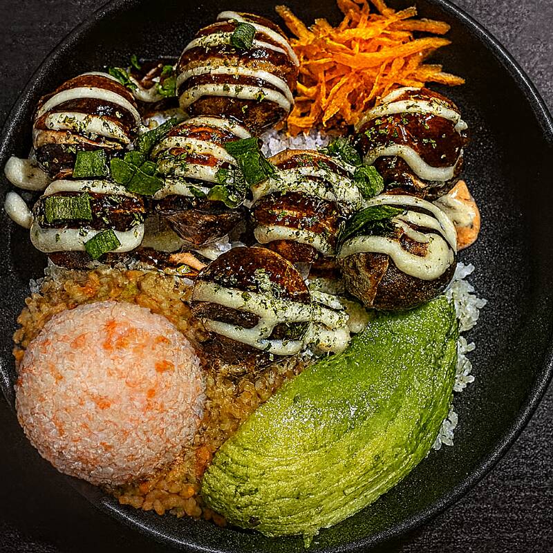 8 Bolitas de masa fritas con rellenos a elegir, con aderezo de chipottle, aderezo de mayonesa, salsa takoyaki y alga en polvo. Cama de arroz blanco, bola de tampico, zanahoria y aguacate