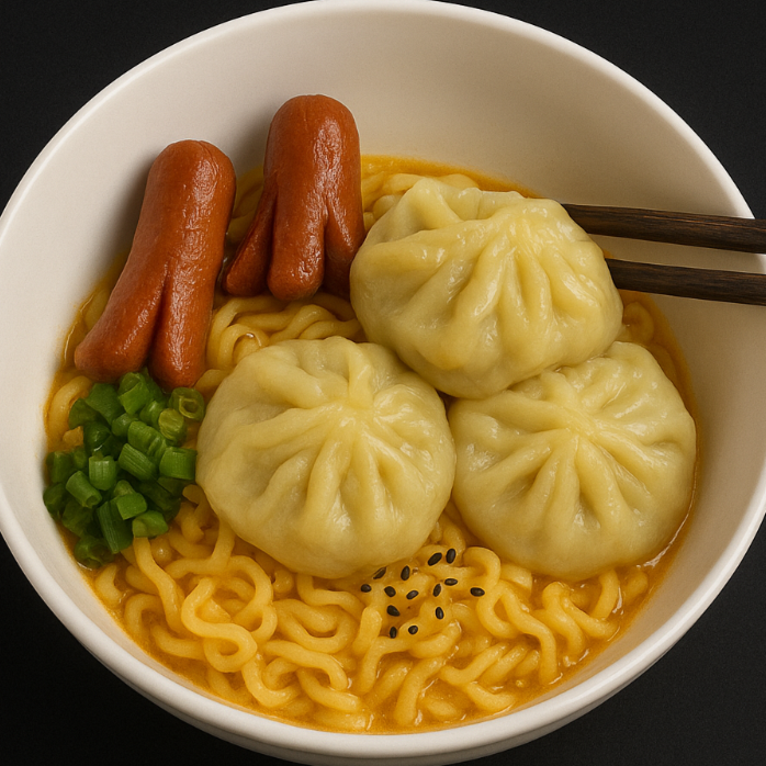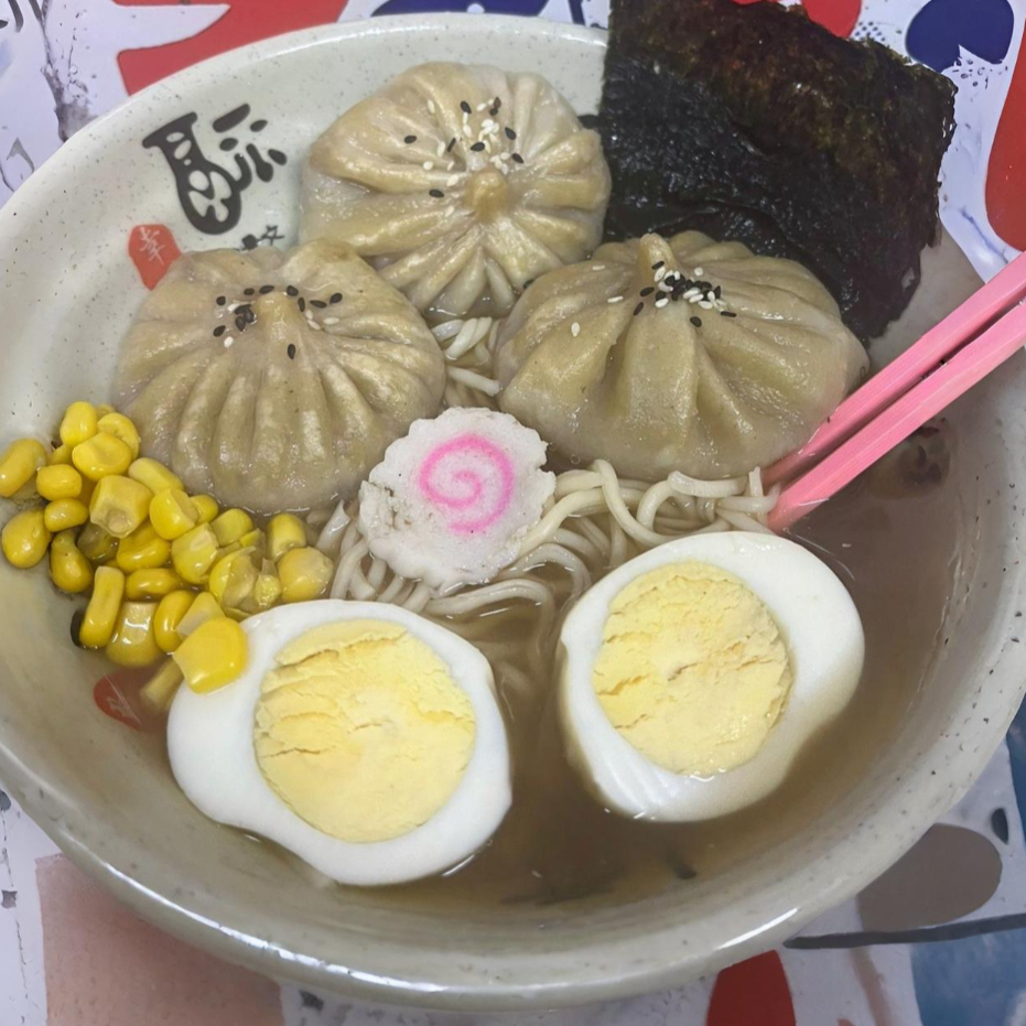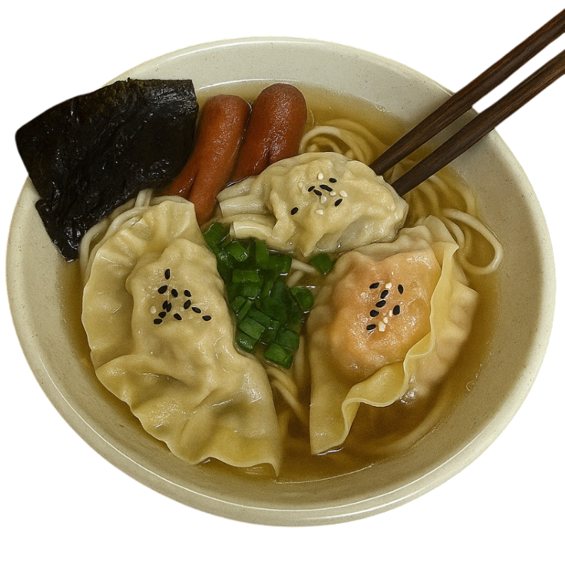 Caldo a base de res y cerdo, 3 gyoza rellenos a su elección, 2 salchipulpos, pasta de harina de huevo, cebollín.