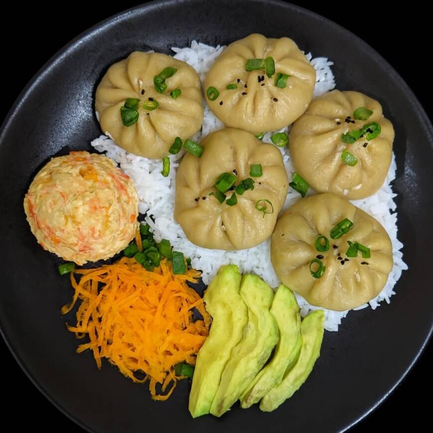 Cama de arroz Gohan acompañado de aguacate, zanahoria, 5 dumplings y 1 Bola de Tampico.