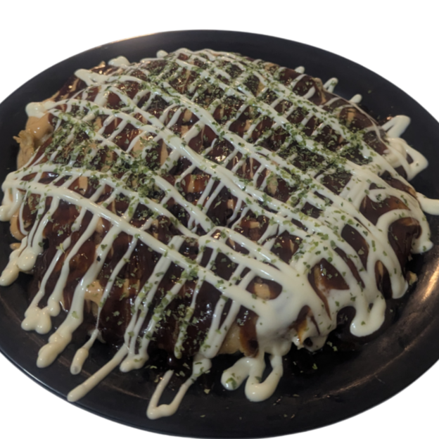 Tradicional tortilla Japonesa con relleno a escoger, preparada al momento con repollo fresco, huevo y una base de tocino, bañada en salsa okonomiyaki, mayonesa, coronada con alga en polvo y estracto de bonito seco.