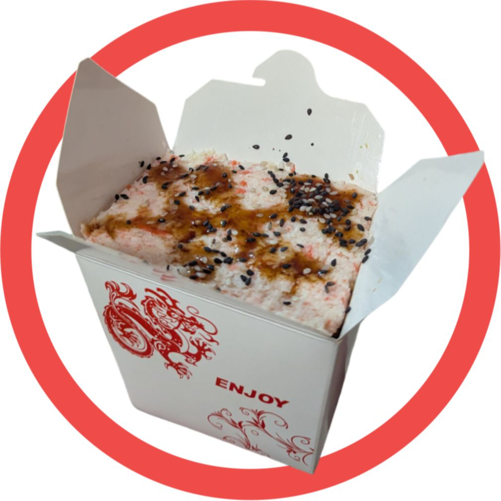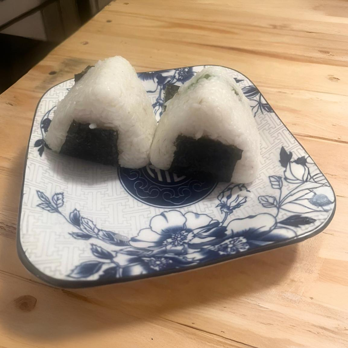 Arroz blanco prensado en forma de triangulo con un cuadro de alga, relleno de surimi y queso crema