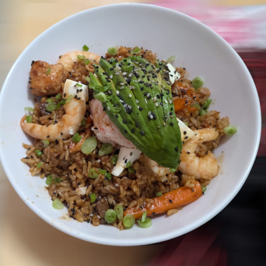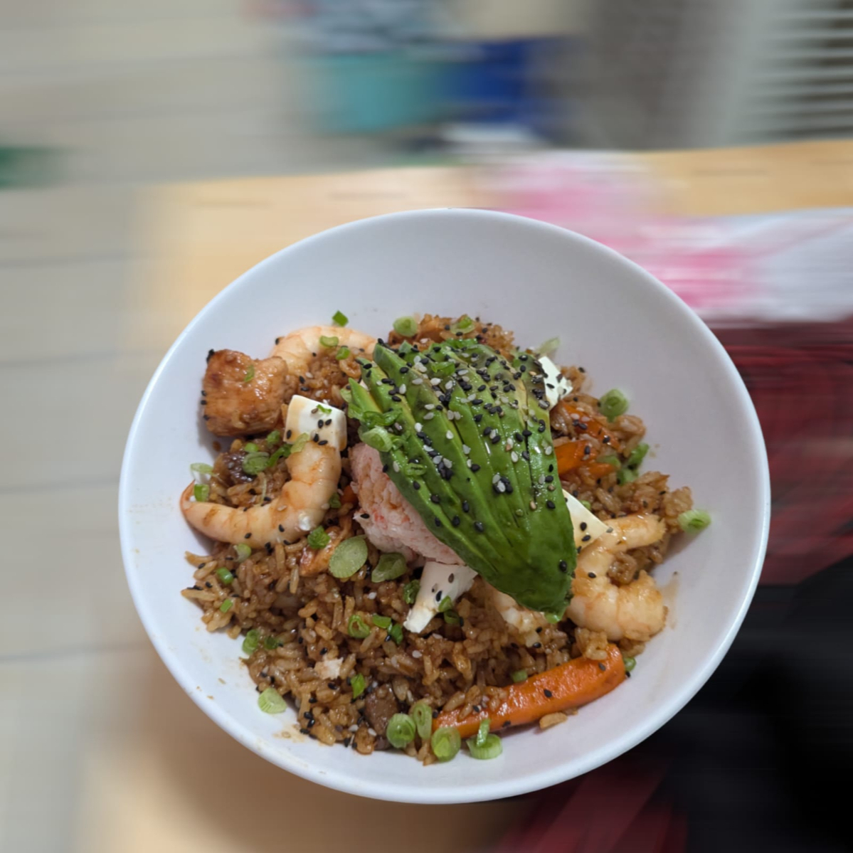 Arroz frito con proteina de pollo, res, cerdo. Salteado con verduras, queso crema, aguacate, cebollin, tampico