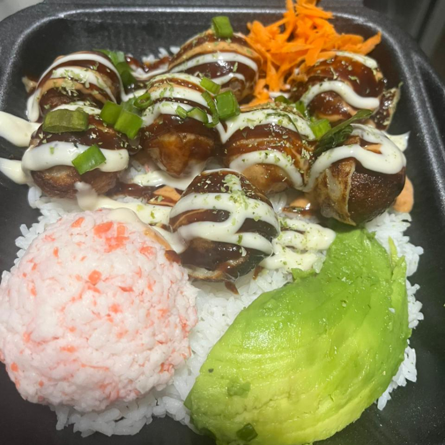 Cama de arroz yakimeshi acompañado de aguacate, zanahoria , 8 Takoyakis y 1 Bola de Tampico