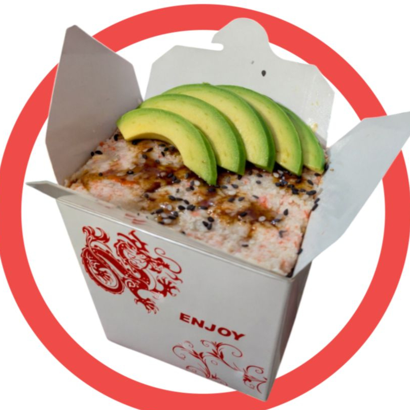 Arroz frito salteado con pollo y verduras. Acompañado de aguacate, queso crema, tampico, cebollin y ajonjoli.