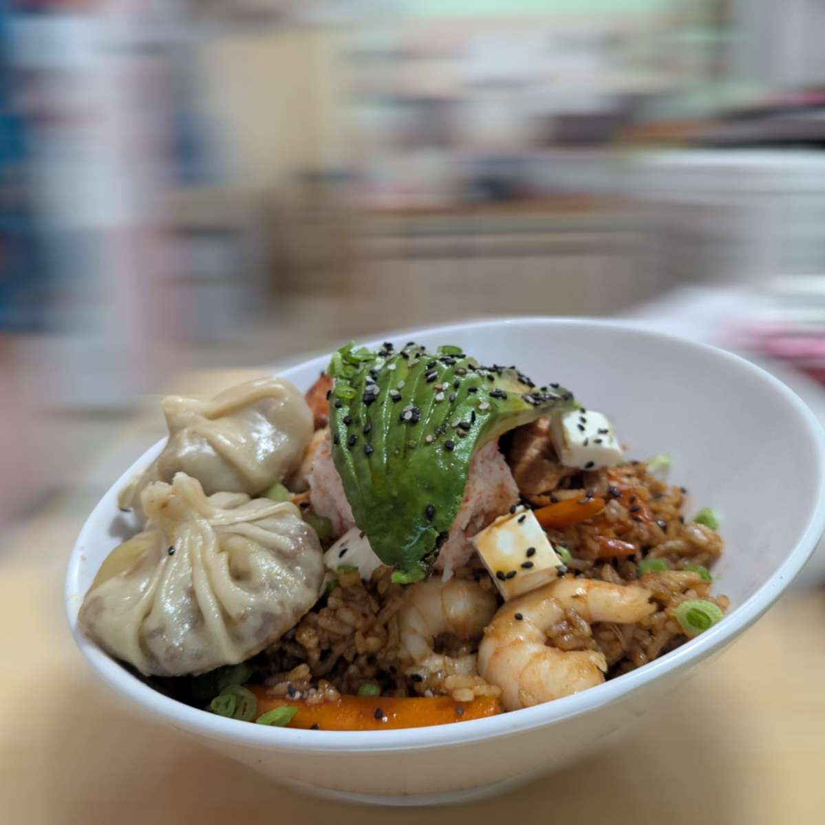 Arroz frito Mixto salteado con verduras, queso crema, aguacate, cebollin, tampico, 2 dumplings.