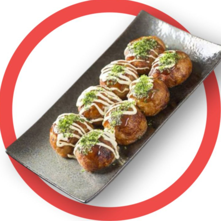 8 Bolitas de masa fritas con rellenos a elegir, con aderezo de chipottle, aderezo de mayonesa, salsa takoyaki y alga en polvo.