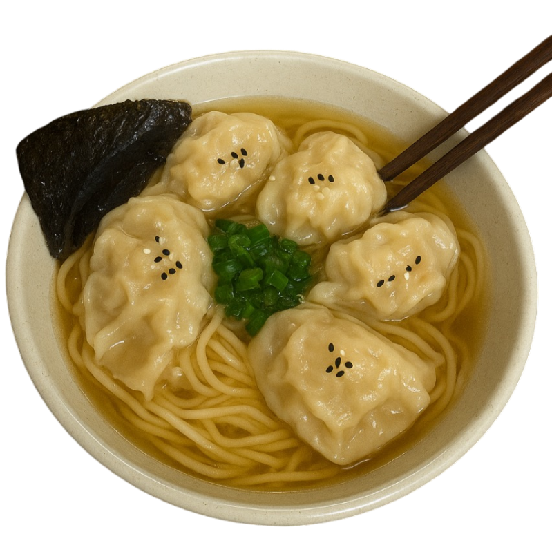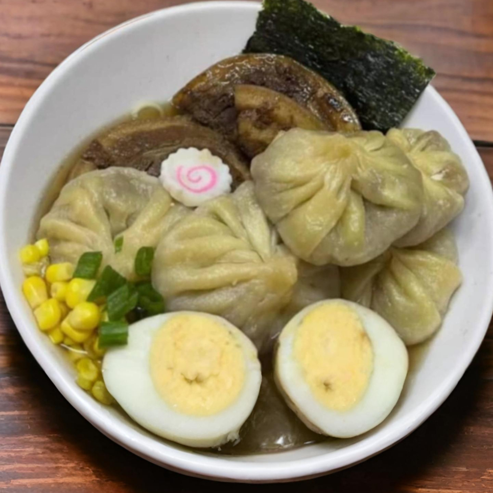 Caldo a base de res y cerdo, huevo, 5 gyoza rellenos a su elección, pasta de harina de huevo, cebollín.