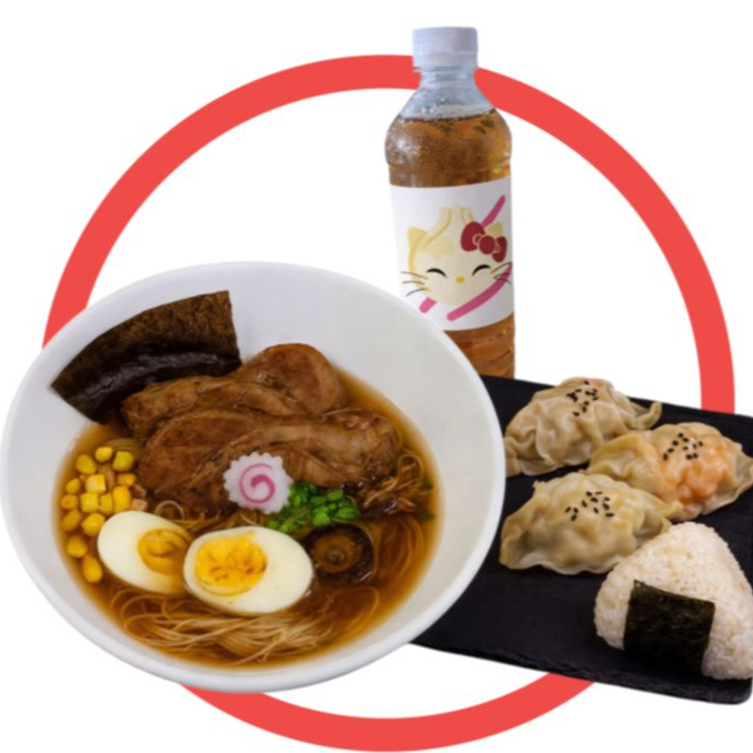 Ramen Pork Power*1 + Onigiri*1 + orden de 3 gyoza*1 + 1 bebida embotellada*1
